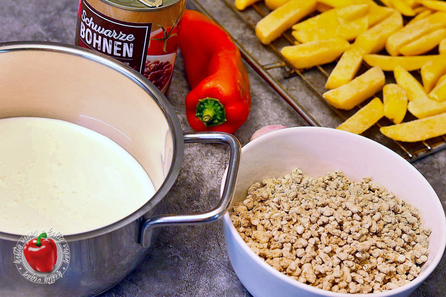 Als Alternative zu Hackfleisch verwende ich das von mir über alles geliebte Sonnenblumenhack¹. Du kannst gerne auch auf Sojagranulat¹ zurückgreifen, musst aber unter Umständen das Rezept in der Zubereitung dann ein wenig anpassen. Das Granulat muss i. d. R. erst gebrüht werden vor dem Braten. Für eine cremige Käsesauce greife ich auf Pflanzensahne und veganes Käsearoma zurück. Das Aroma erhältst du online bei einigen Versandshops. Du kannst aber auch auf Cheddar-Style-Käsescheiben aus dem Supermarkt zurückgreifen, wenn du möchtest. Diese sind auch entsprechend aromatisiert und bereits gefärbt. In Kombination mit Paprika, Paprikapulvern, Salz und Speisestärke wird daraus eine sämige und überzeugende Sache.