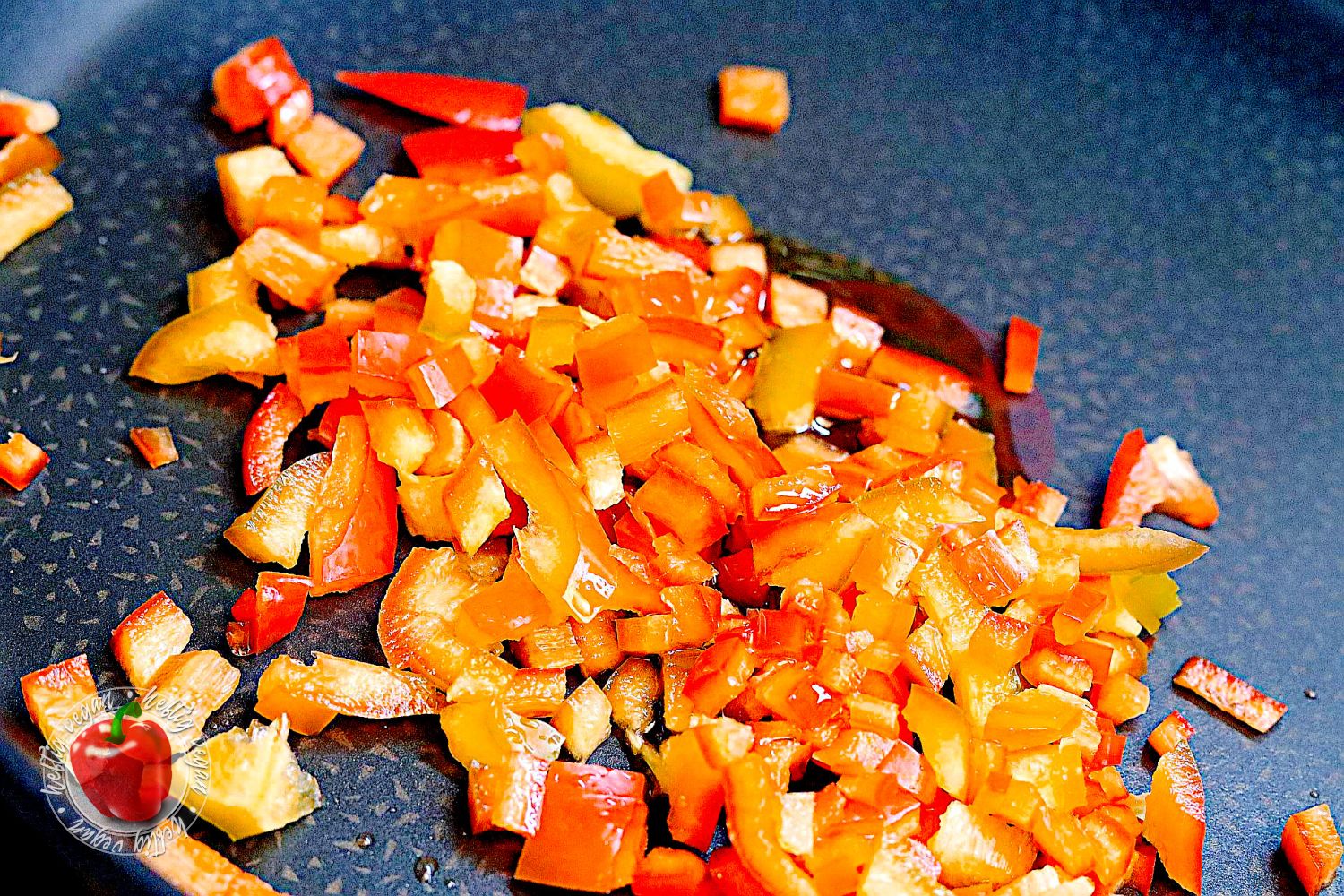 - Paprika waschen, von Kernen und Strunk befreien und fein würfeln. Anschließend mit wenig Fett in der Pfanne anbraten.