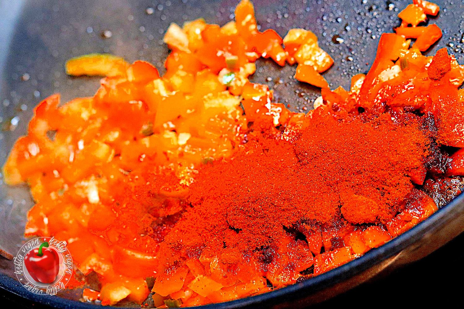 - Die Paprikapulver an die Paprikawürfel geben und kurz mit braten.