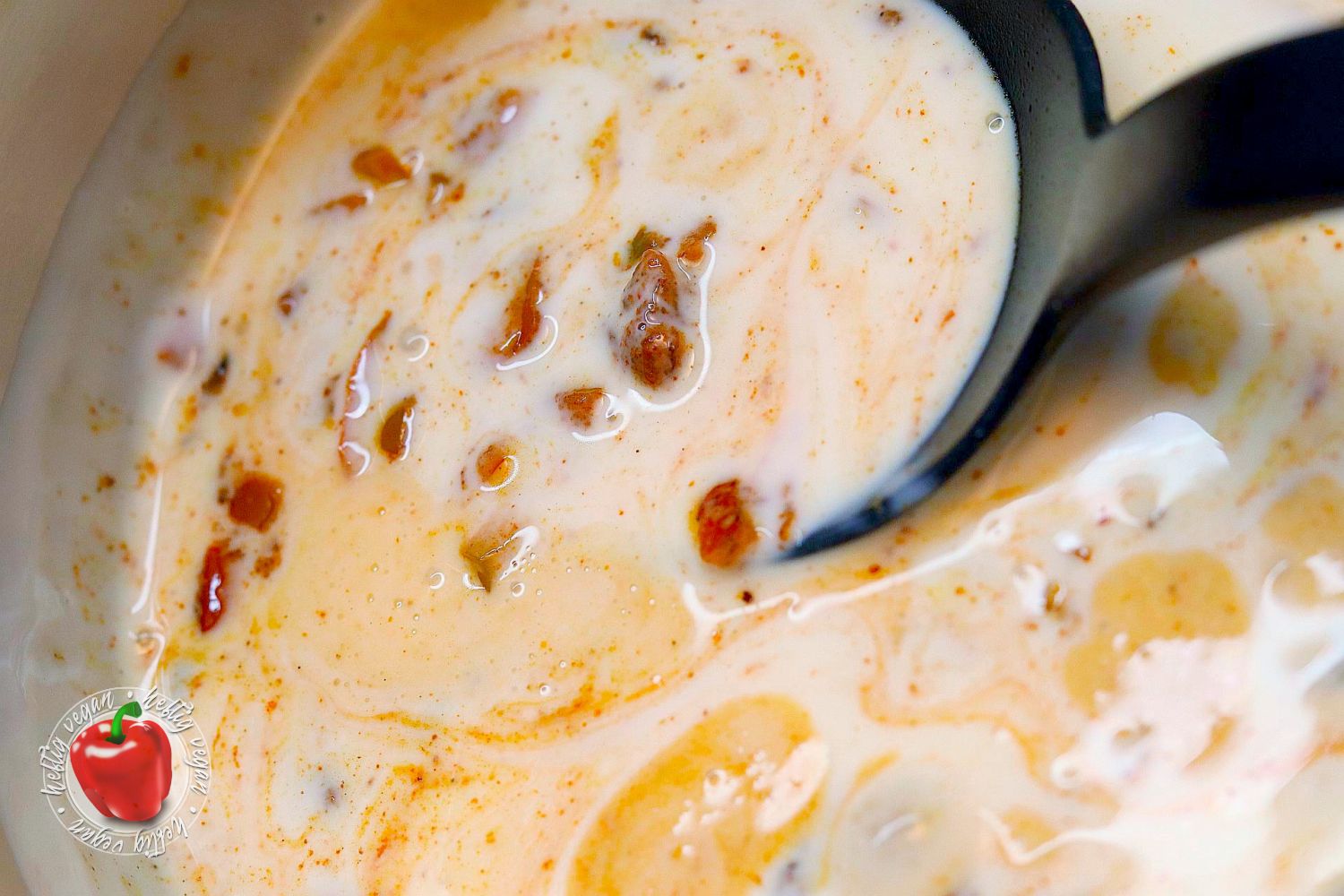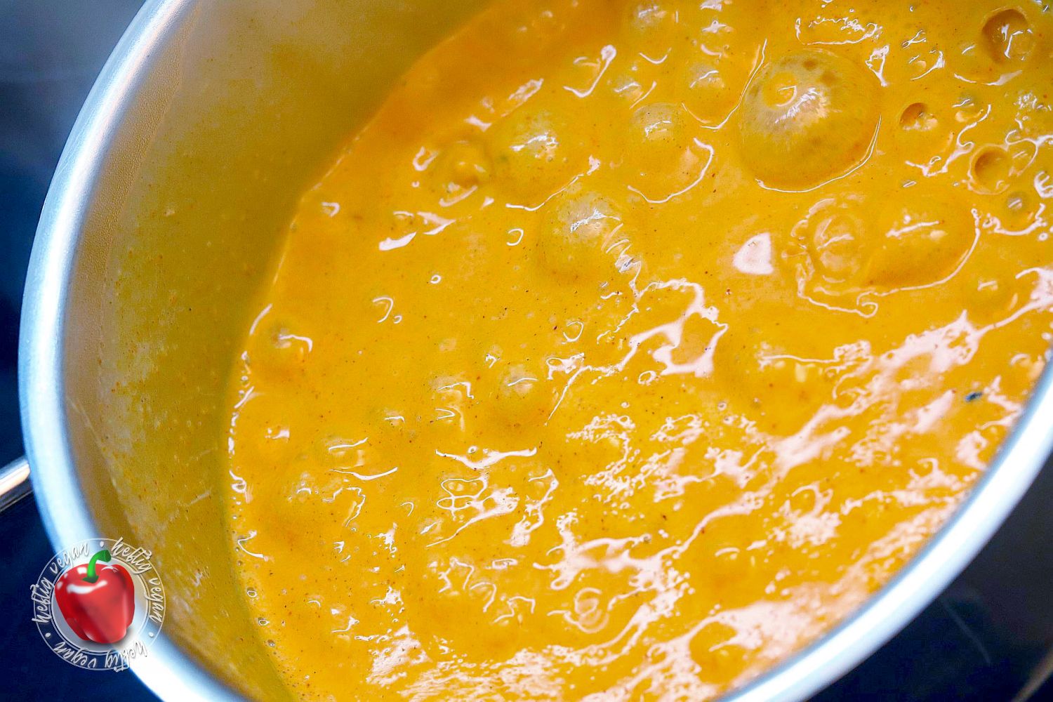 - Anschließend mit Pflanzensahne ablöschen. Mit Zitronensaft und Käsearoma (oder Käsescheiben) vermengen und verrühren.