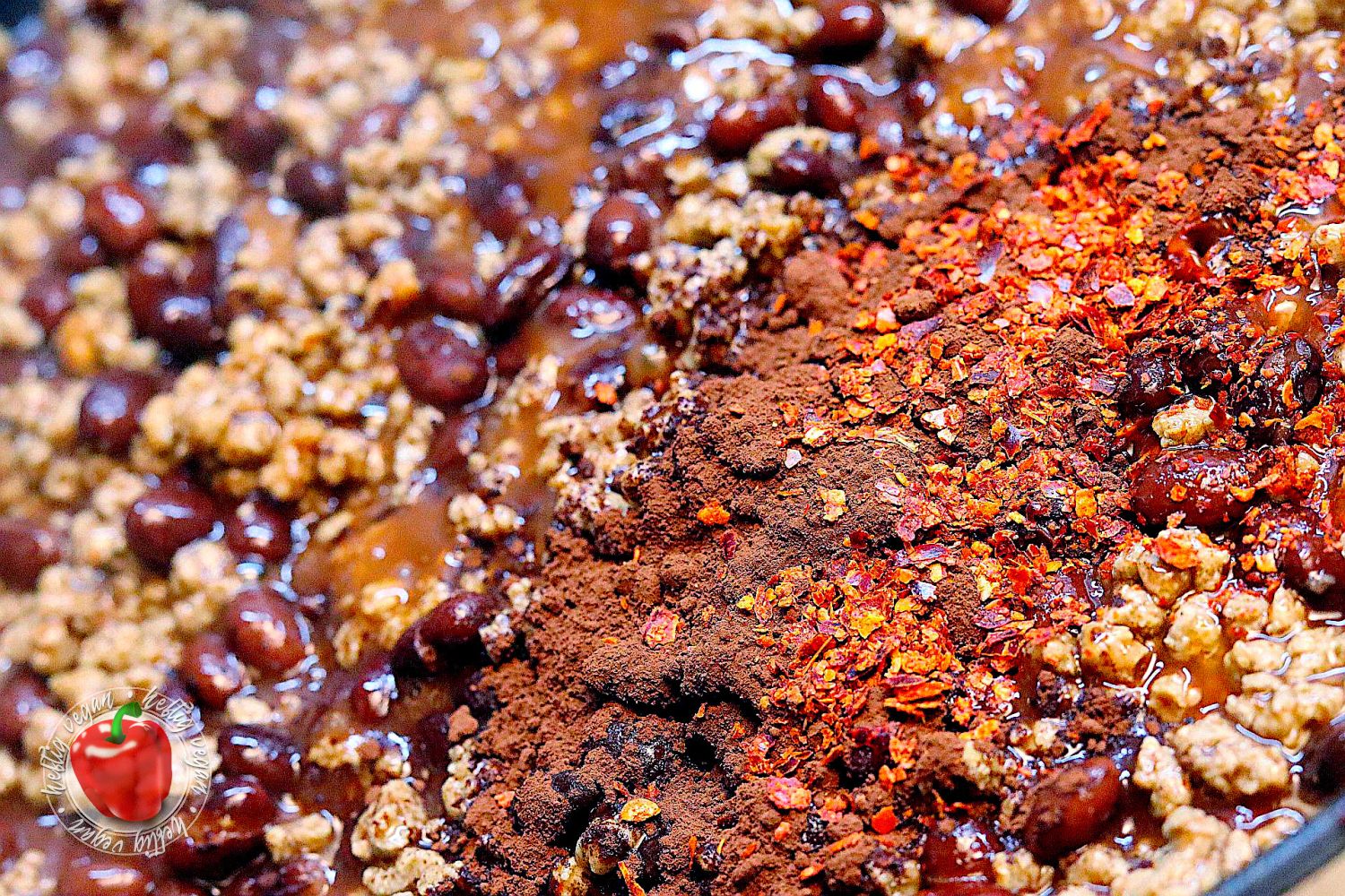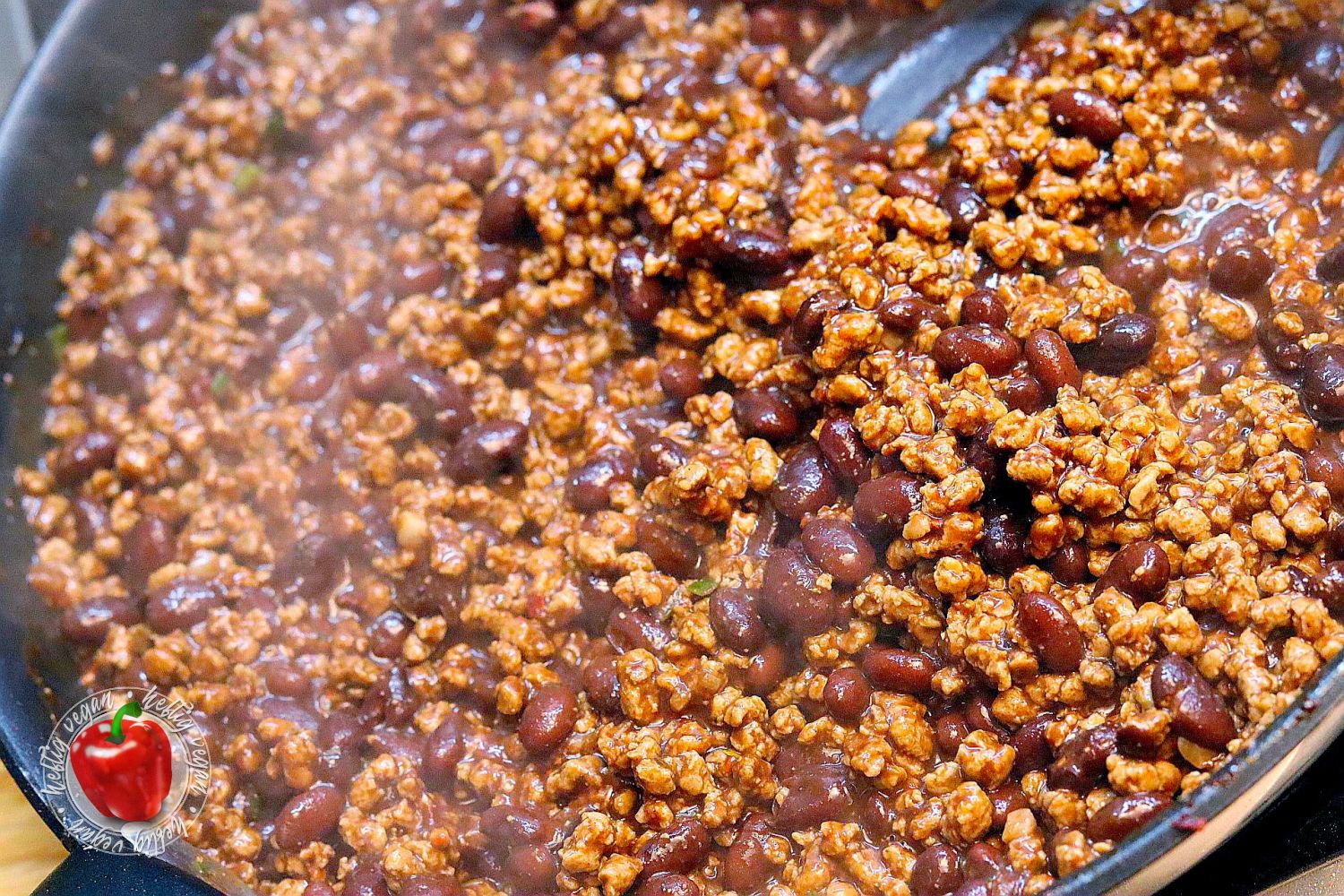- Wasser in einer großen Pfanne erhitzen und das Sonnenblumenhack darin dünsten. Nach 1-2 Minuten die Bohnen samt Flüssigkeit hinzugeben und aufkochen (ggf. etwas mehr Wasser nachgießen).