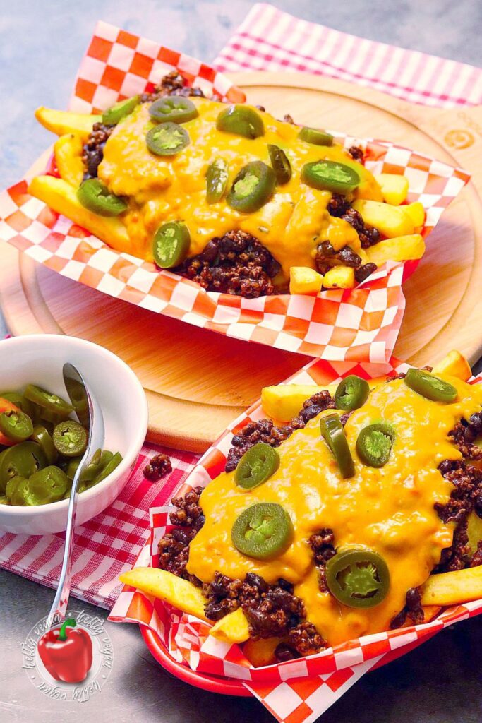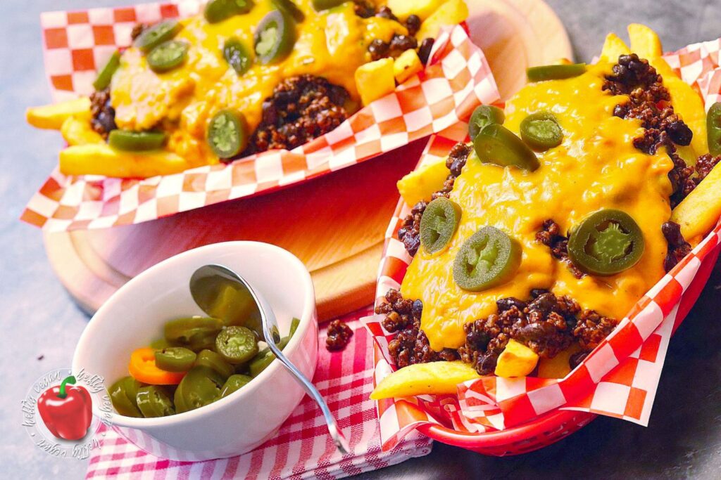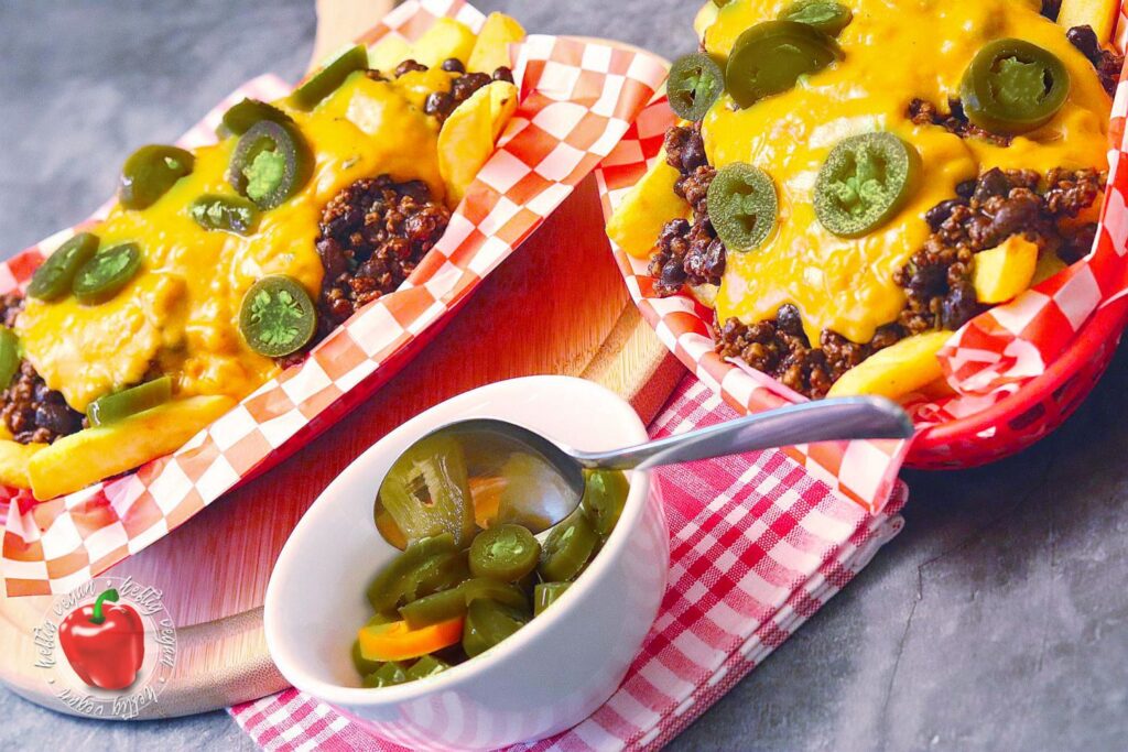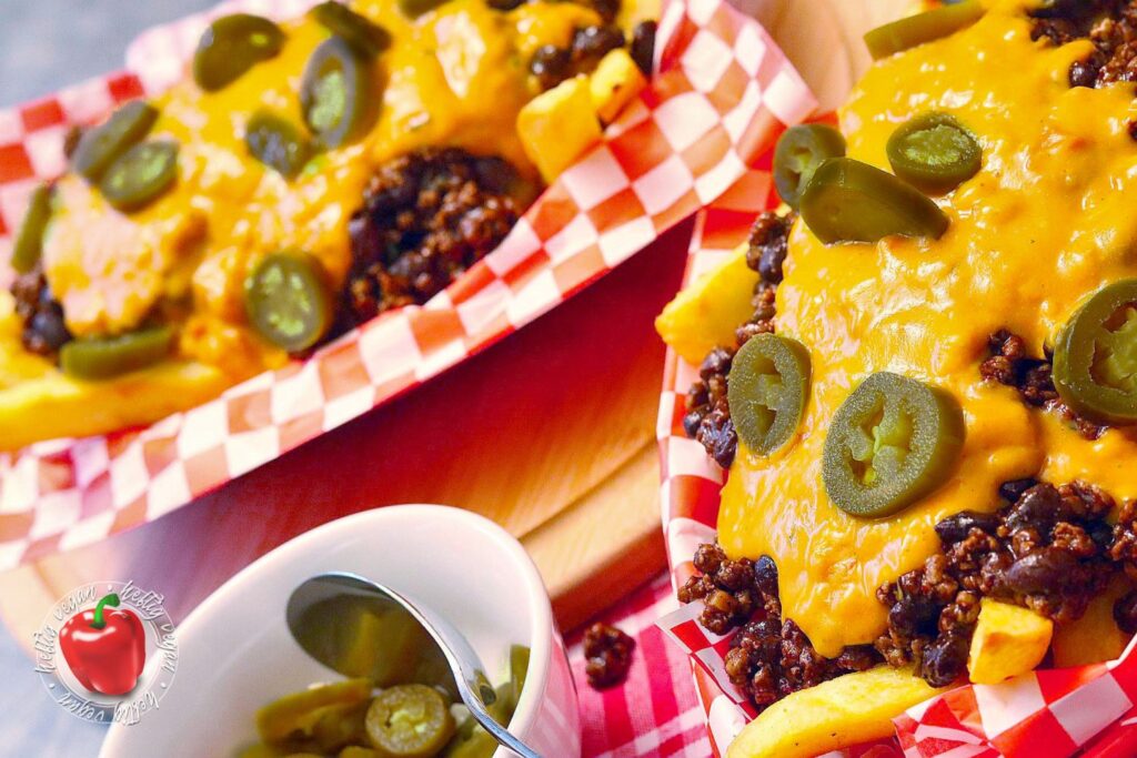 Und da wären wir nun endlich beim eigentlichen Thema: Den Chili-Cheese-Fries. Es handelt sich also um Kartoffelstäbchen – in meinem Fall aus dem Ofen und nicht aus der Fritteuse. Serviert mit einem üppigen Topping aus würzigem Bohnen-Hack-Gemisch alias Chili und Käsesauce. Gespickt mit säuerlich-scharfen, eingelegten Jalapeños. Ein Gericht das als Snack, Beilage oder Hauptgericht in vielen American Diners oder Roadhouses geordert werden kann.