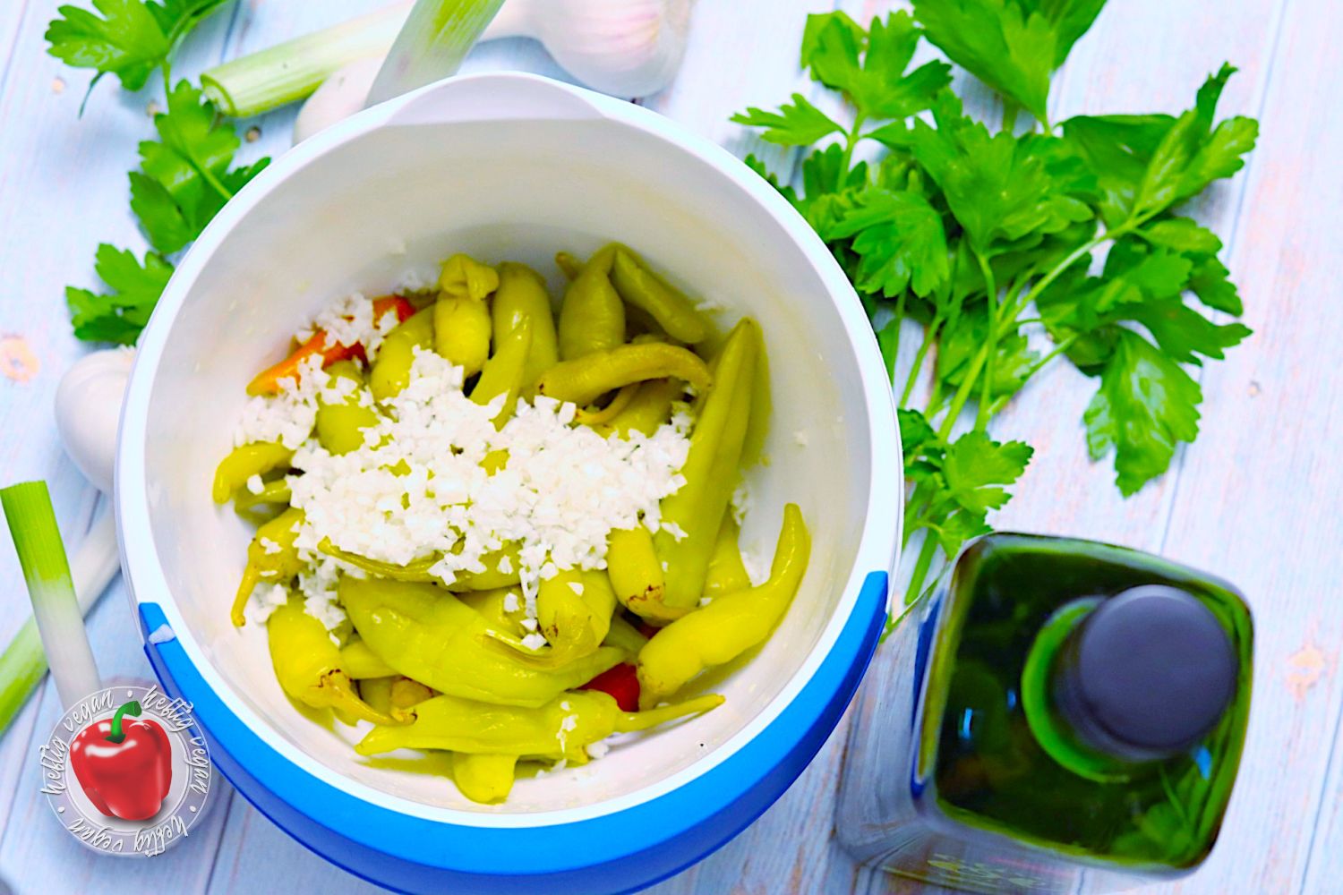 - 250 g Peperoni, abgetropftPeperoni abtropfen und in eine Schüssel geben.