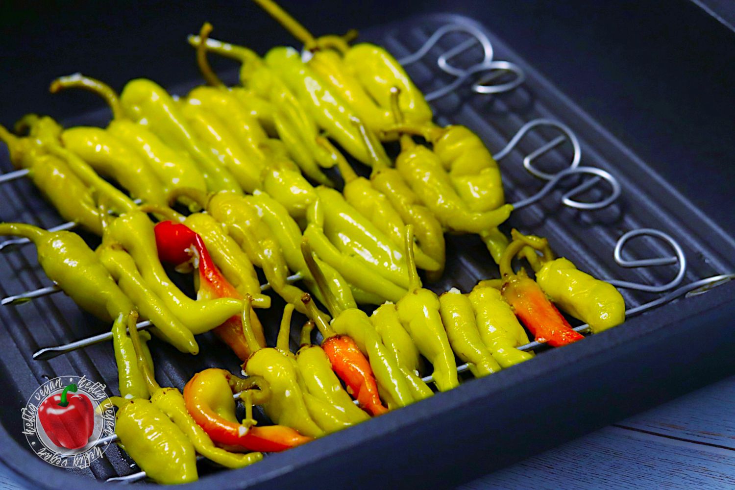 Da die Peperoni trotz Salzlake relativ dünnwandig sind und somit wenig Flüssigkeit binden, würde ich die Zubereitung im Ofen nicht empfehlen. Auch wenn die ölige Marinade die Grillspieße bestmöglich umhüllt, wird das Ergebnis bei einer Zubereitung im Ofen schnell trocken. Wenn du dies dennoch ausprobieren möchtest, sorge für eine sehr starke Hitze und eine kurze Zubereitungsdauer, sodass die Grillspieße die Möglichkeit haben noch vor dem „Austrocknen“ Farbe zu nehmen.