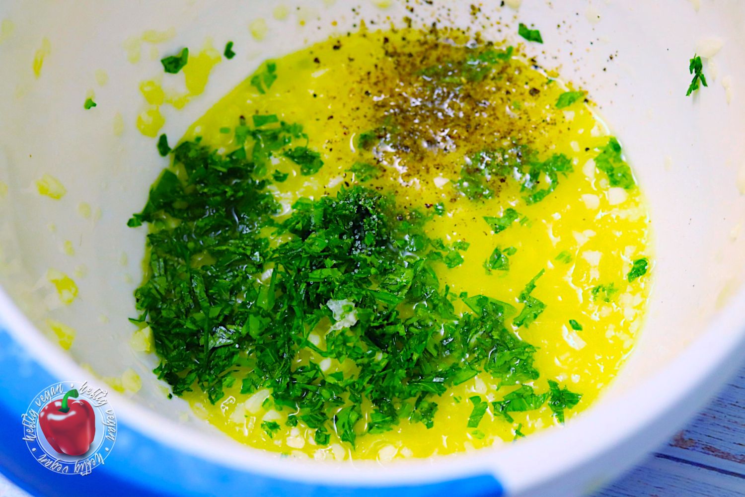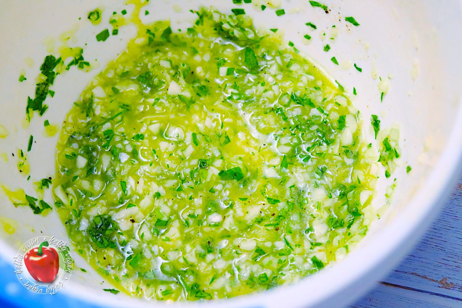 - 4 Zweige Petersilie1 Prise Salzn. B. PfefferPetersilie waschen, trocken tupfen und fein hacken. Zum restlichen Knoblauchöl geben, mit Salz versehen und nach belieben Pfeffern.