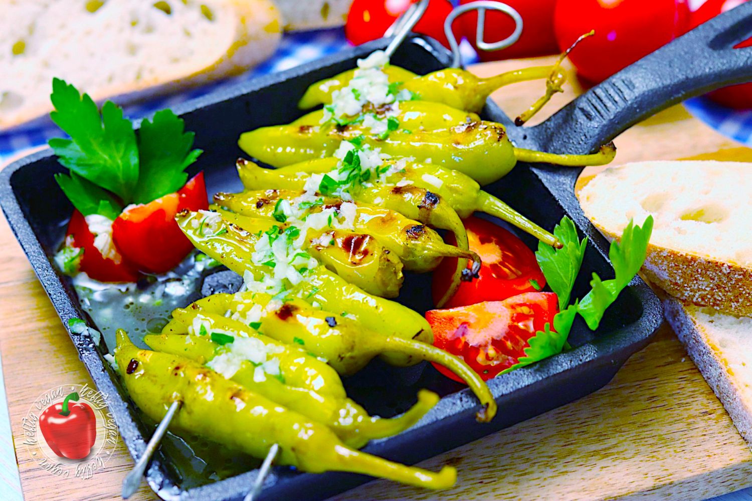 Ein paar bekannte Beispiele für Vorspeisen, die zumindest vegetarischer Natur sind, stellen unter anderem Tsatsiki, Fava, Dakos oder Skordalia dar. Zumindest auf den Speisekarten griechischer Restaurants in Deutschland zu finden sind eben auch jene Griechische Peperoni am Grillspieß, in Knoblauch und Olivenöl, meist mit Weißbrot gereicht.