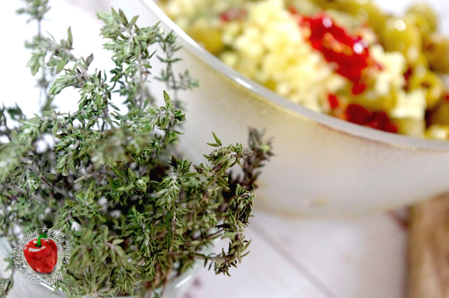 - Den Knoblauch schälen und fein hacken. (Hast du frische Kräuter da, solltest du sie vorher waschen. Falls sie schon getrocknet sind (in meinem Fall habe ich sie selbst getrocknet und vor Wochen schon gewaschen gehabt) kannst du diese direkt verwenden.) Die Blätter von den Kräuter-Stengeln zupfen und mit einem sehr scharfen Messer sehr fein herunter schneiden. Alles zu den Oliven geben.