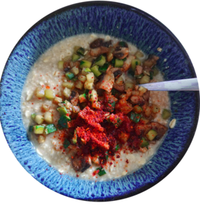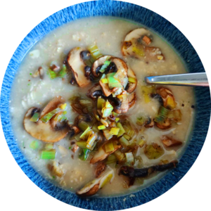 | Fruchtiges Porridge mit Himbeeren, Banane und Zimt | Haferbratling mit gedünstetem, indischen Blumenkohl | Herzhaftes Porridge mit gebratenen Champignons und gedünstetem Lauch |