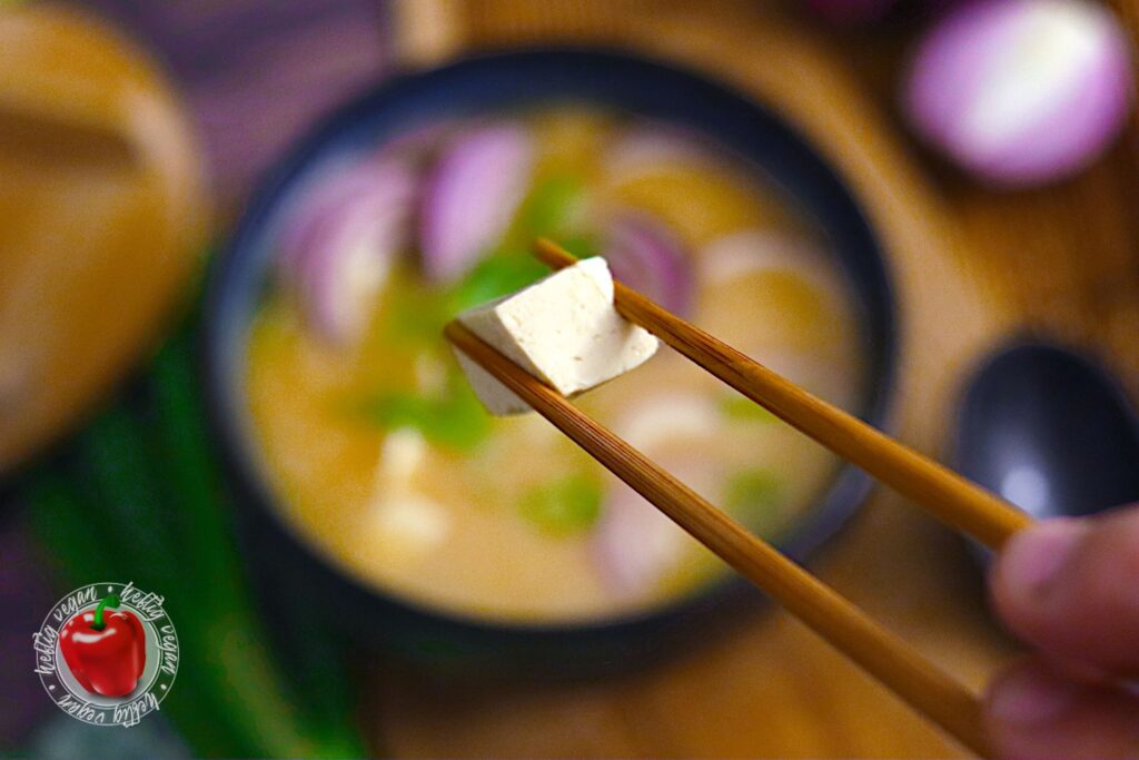 Nun zu den spannenden Komponenten, die diese Suppe zu einem sättigenden Mahl machen: Tofu, Lauchzwiebeln und rote Zwiebeln. Der Tofu fügt nicht nur eine angenehme, bissfeste Textur hinzu, sondern liefert auch eine Menge pflanzliches Protein. Je nach Sorte können die Scheiben Tofu 10 bis 20 % Proteine beinhalten. Darüber hinaus kommen viele positive Inhaltsstoffe aus der Sojabohne mit dazu.