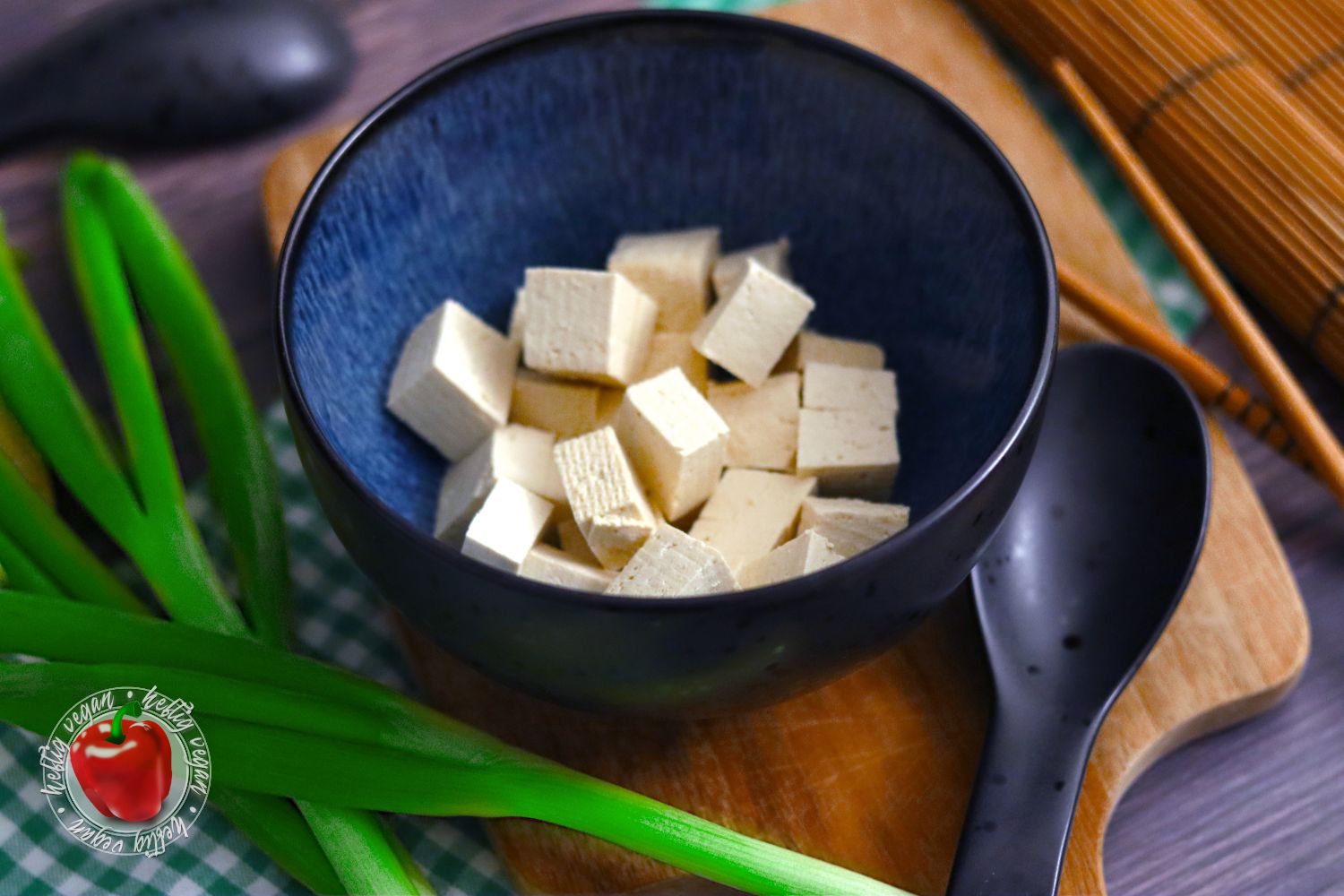 - Den Tofu in mundgerechte Würfel schneiden. Nun für ca. 2 Minuten in der Mikrowelle erhitzen. (Alternativ in einem Topf mit wenig Wasser kochen, bis der Tofu heiß ist. Das Wasser verwerfen.)