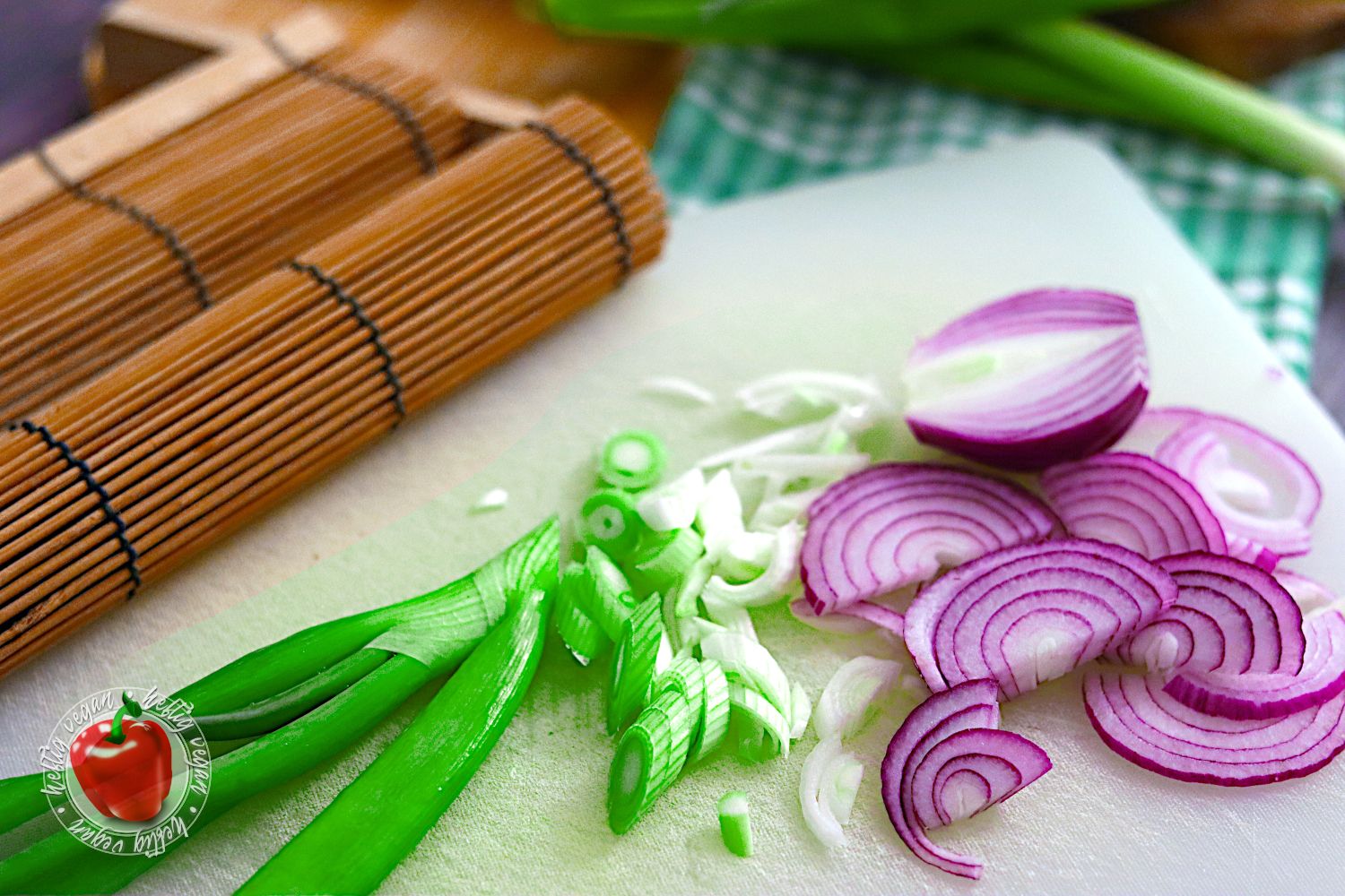 - 1 Stück Lauchzwiebel1 Stück rote Zwiebel, frischIn der Zwischenzeit Lauchzwiebeln waschen und trockentupfen. Rote Zwiebel schälen. Beides in feine Scheiben schneiden.
