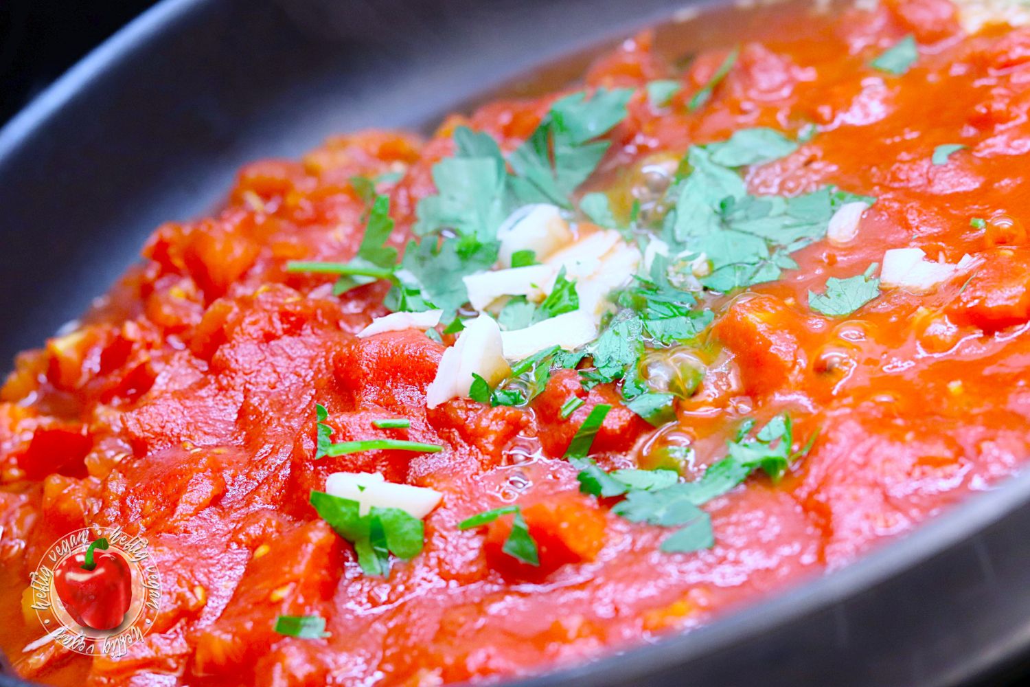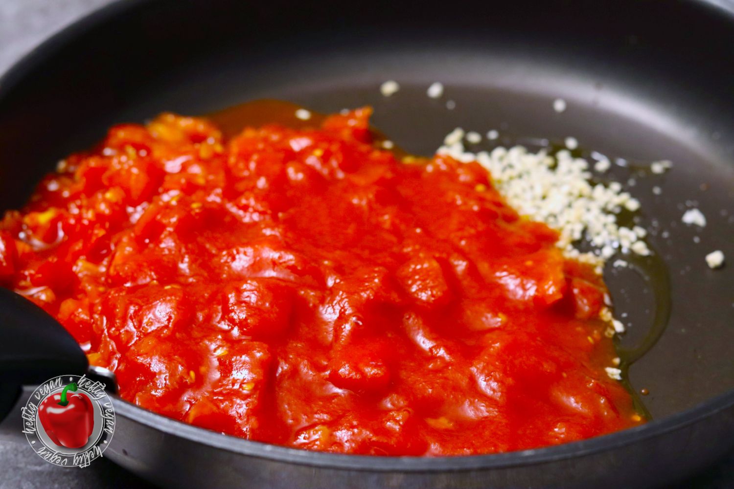 - 1 Stück Zwiebel, mittelgroß1 EL Olivenöl¹150 ml Weißwein¹, veganNun Zwiebel schälen und in feine Würfel hacken. In einer zweiten Pfanne mit Olivenöl anschwitzen. Anschließend die Tomaten hinzugeben und zum kochen bringen. Mit Weißwein ablöschen.
