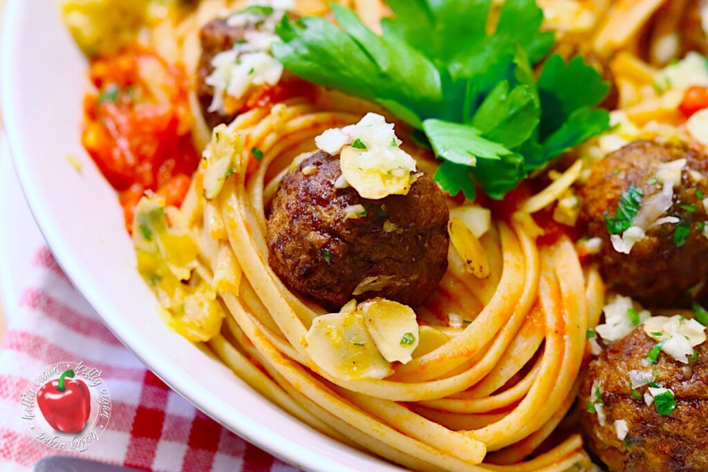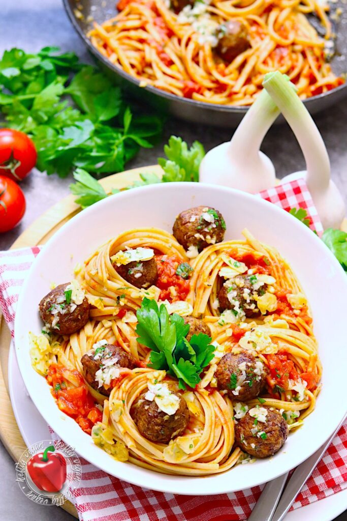 Grundsätzlich funktioniert dieses Rezept vermutlich mit jeder Art von loser Pasta. Lose Pasta? Damit meine ich, dass Lasagneplatten oder Cannelloni und Fleischbällchen eher nicht so gut zusammen passen. Penne, Spirelli, Fusilli & Co. schon eher. Doch am besten kommt die Kombination meines Erachtens zur Geltung, wenn du längliche Teigware verwendest. Darunter (wie hier zusehen) Linguine, Spaghetti, Bucatini, Tagliatelle oder Fettuccine.
