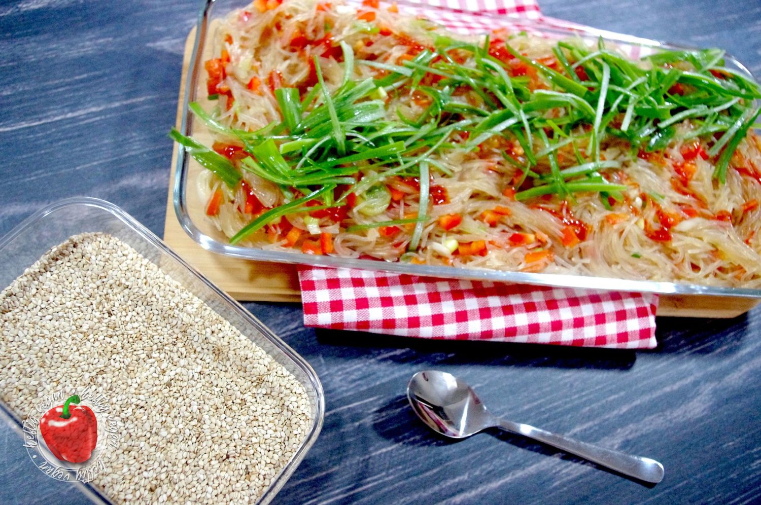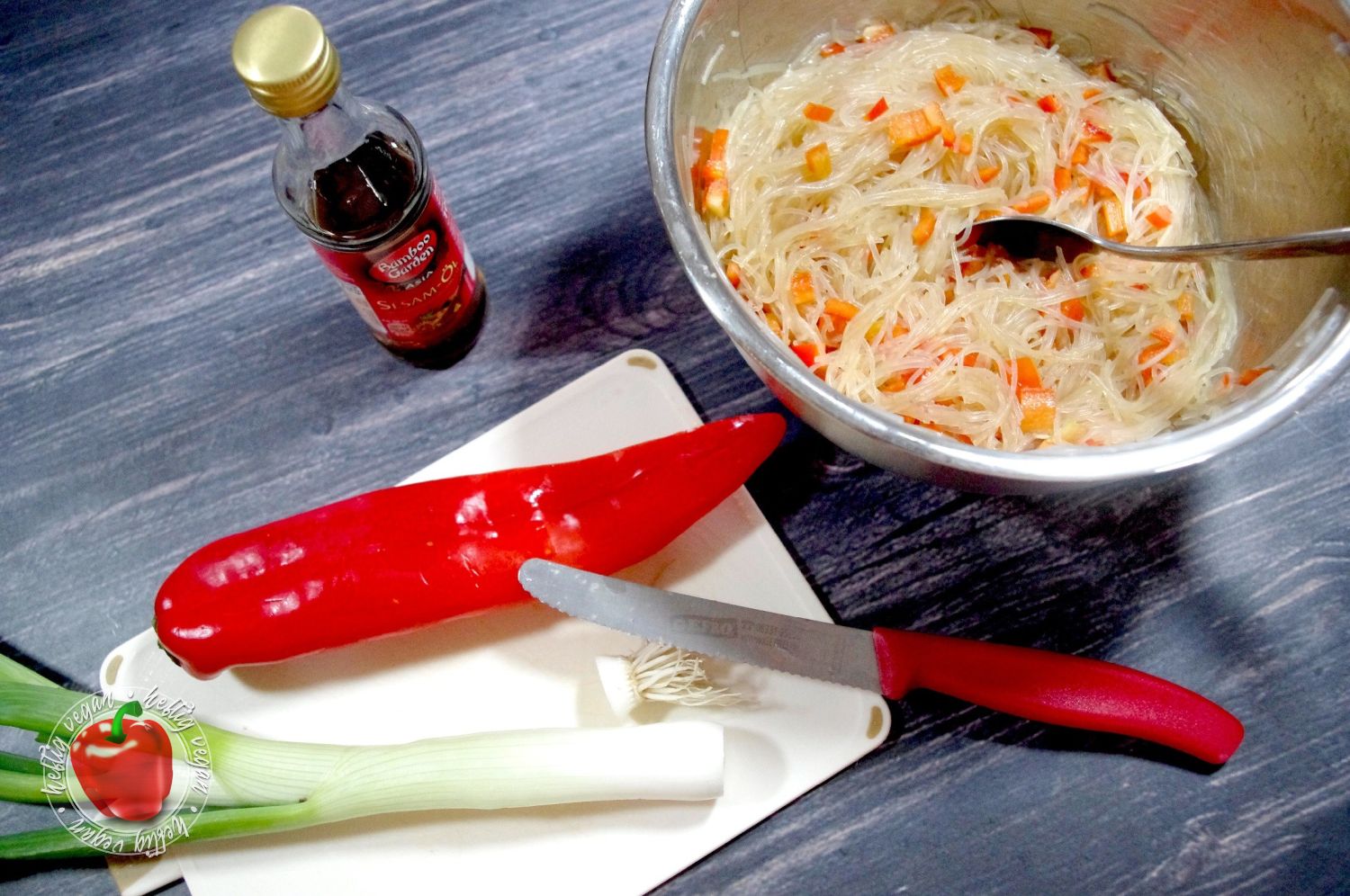 - Die Glasnudeln mit einer sauberen Küchenschere mehrfach zerschneiden, durch ein Sieb abgießen. Mit Sesamöl, Hoisin- und Sojasauce, Gewürzen und Salz würzen und alles kräftig vermengen. Nun die Paprika und den hellen Teil der Lauchzwiebel unterheben.