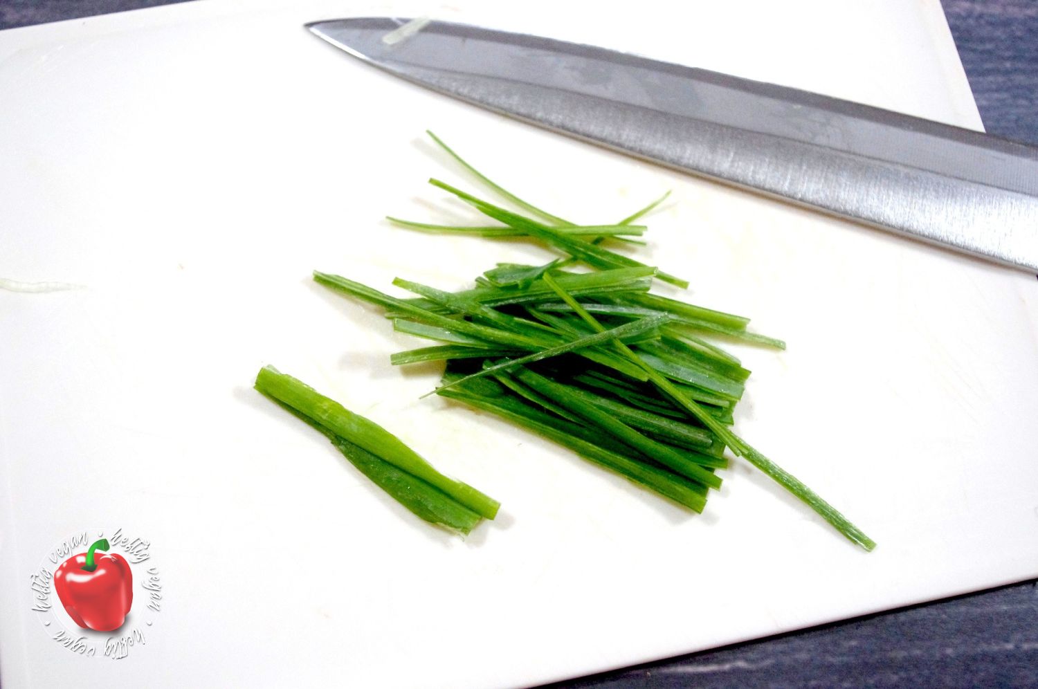 - Das Grün in ca. 4 cm große Stücke zerteilen, und diese der Länge nach fein aufschneiden, sodass sich feine Stäbchen ergeben. Zur Seite legen.