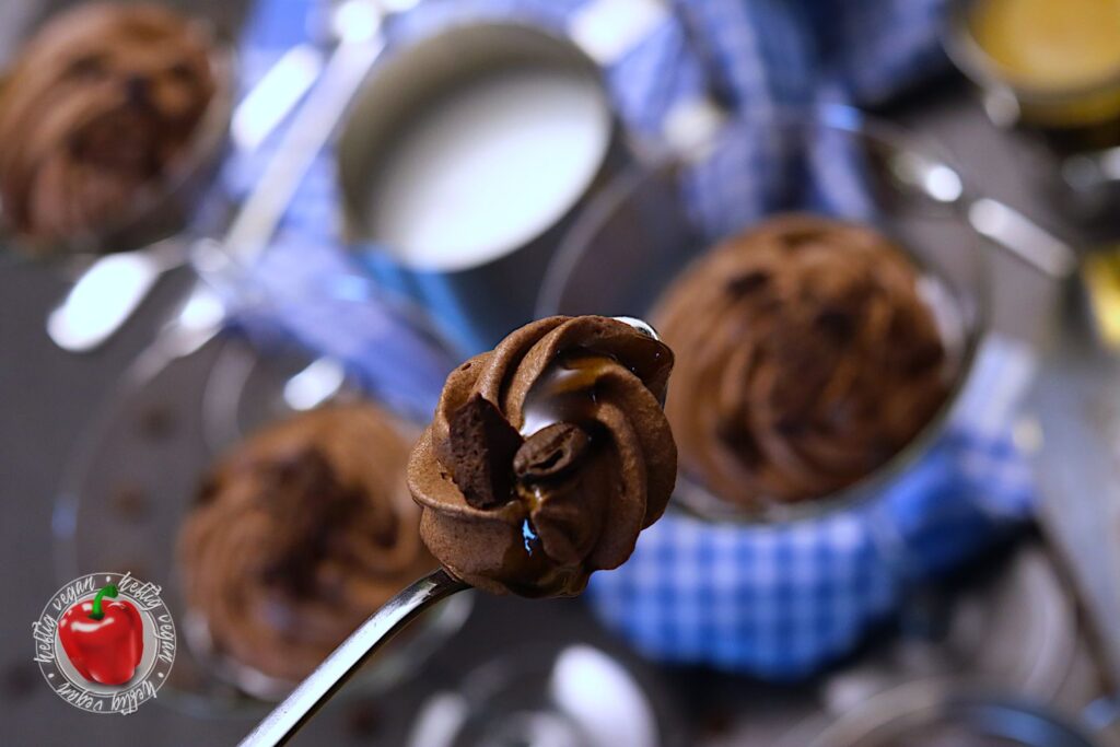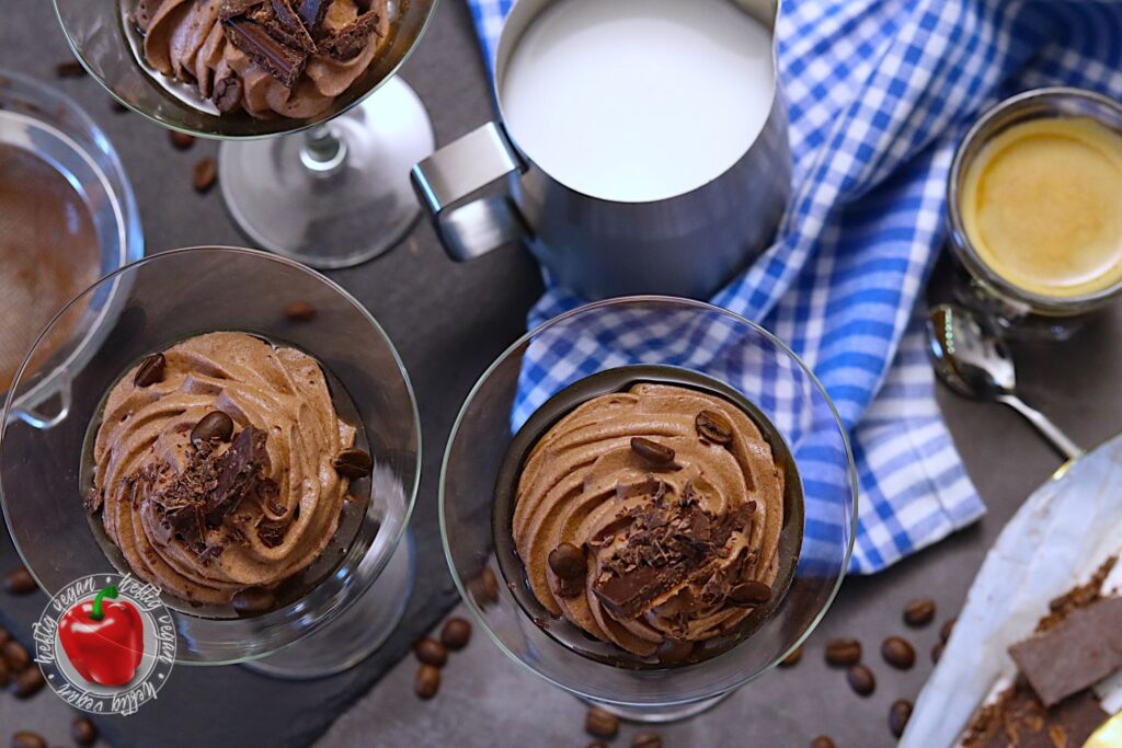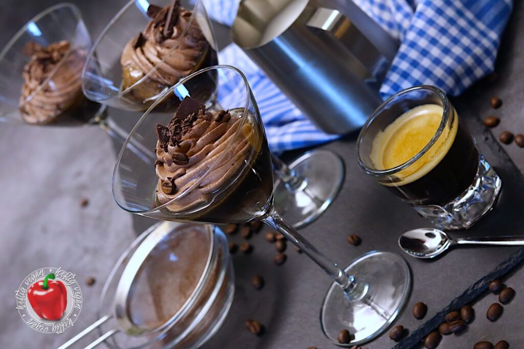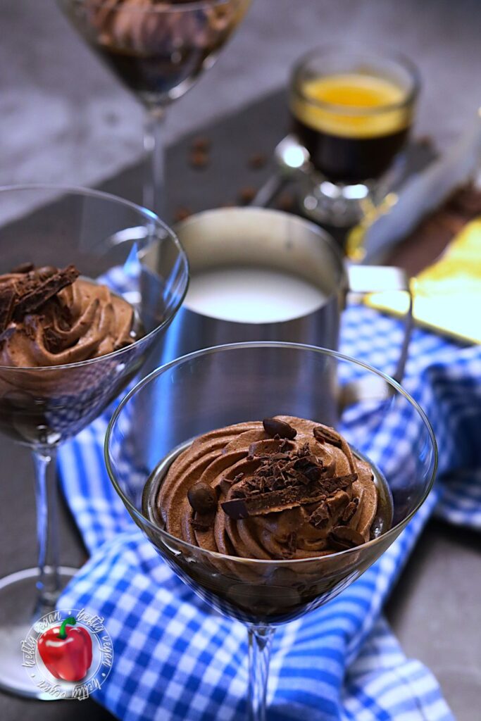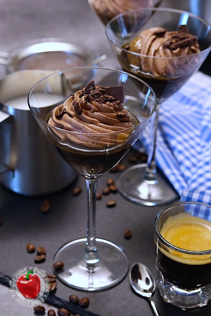 Vieeeel über Mokka, einem Moka und Espresso gesprochen. Aber was ist nun eigentlich mit der Mokkacreme? Nun, bei meiner schnellen Mokkacreme handelt es sich um ein Dessert auf Basis von Schlagcreme, die mit Kakao und Kaffee aromatisiert wird. Der vegane Sahneersatz wird mit Zucker aufgeschlagen und anschließend mit Kaffee und Kakao vermengt. Damit sich der Zucker besser löst, kann dieser auch im heißen, frischen Kaffee gelöst werden. Anschließend wird die Mischung gefestigt. Dies kann mit einem Sahnefest¹-Pulver oder einer Stärkemischung geschehen. Ich verwende hierzu das vegane Produkt San-Apart¹.