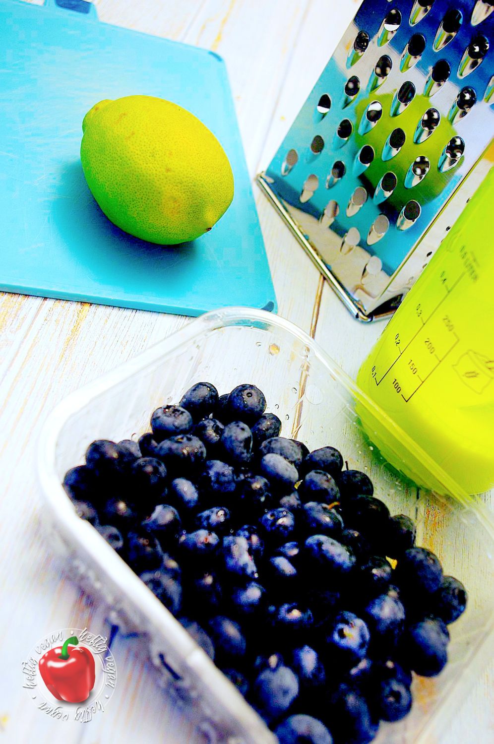 - Die Heidelbeeren und die Zitrone waschen und trocknen. Die Heidelbeeren zur Seite stellen, die Zitrone mit dem Handballen kräftig auf der Arbeitsfläche rollen. Anschließend die Schale abreiben. Nun halbieren und den Saft auspressen.