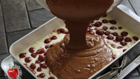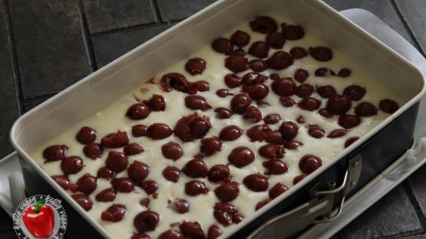 - 1 Glas Kirschen, gut abgetropftKirschen abtropfen und über dem hellen Teig verteilen.