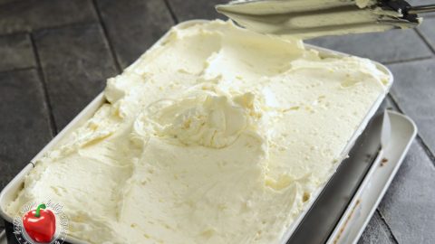 - Die Vanille-Buttercreme nun auf den ausgekühlten Kuchen streichen. Ggf. ein Muster in die Oberfläche streichen.