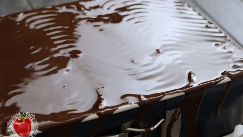 - Die Kuvertüre über die Vanille-Buttercreme des Kuchens gießen und gleichmäßig verteilen. Nicht mit einem Löffel o. ä. verteilen, sondern den Kuchen eher schräg halten und die Kuvertüre darüber laufen lassen.