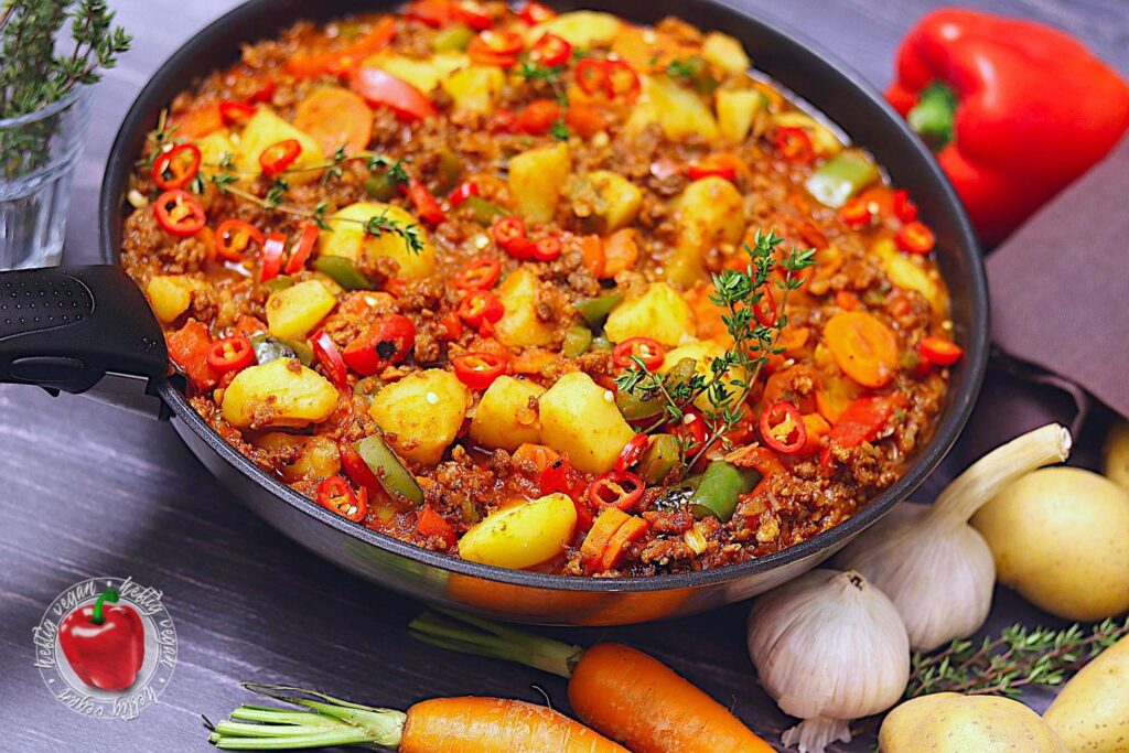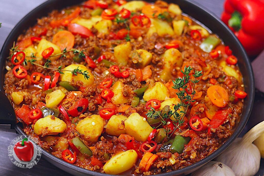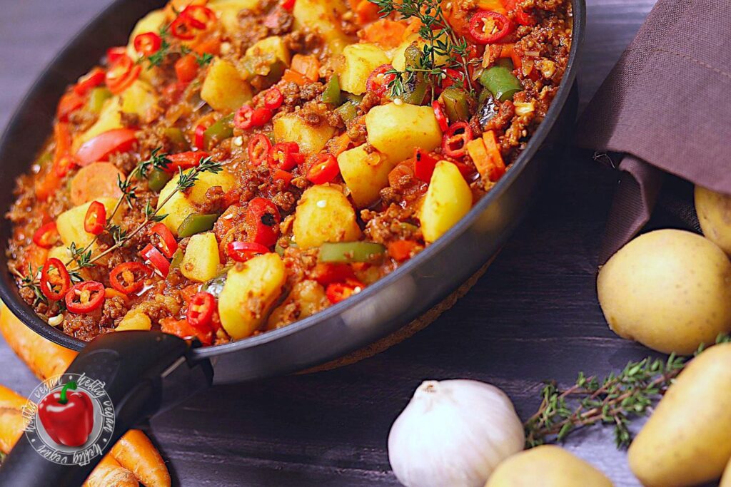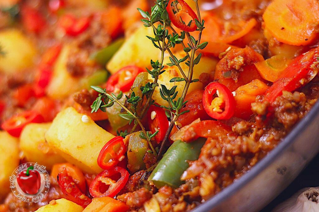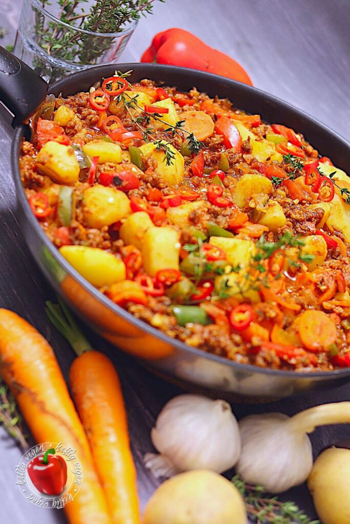 Ich bin mir tatsächlich nicht ganz sicher, ob das Gericht vor Maggi schon existent war oder durch die beliebten Fix-Päckchen erst richtig bekannt geworden ist. Aber den Bauerntopf mit Hack kenne ich als Pfannengericht aus Hackfleisch, Kartoffeln und Paprika. Gegart in einer sämigen, würzigen Tomatensauce. Die Sauce ähnelt durch das verwendete Hackfleisch ein wenig einer Bolognese-Sauce, doch der Tenor ändert sich noch einmal etwas durch die gebratene Paprika darin. Und genau so, möchte ich es wieder genießen. Nur eben rein pflanzlich. Darum greife ich wieder ein wenig in die Trickkiste, hole Kartoffeln, Möhren, Zwiebeln, Paprika und Tomaten hervor und los geht’s.