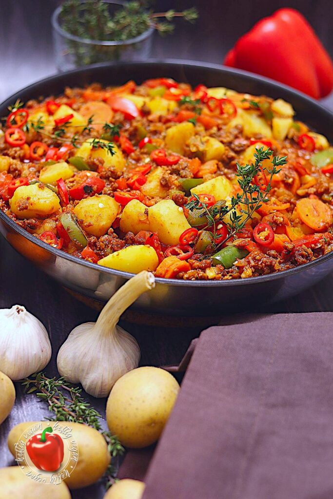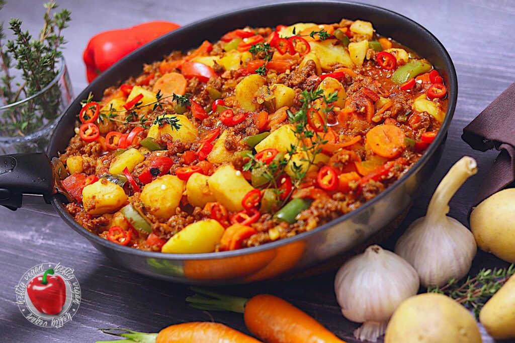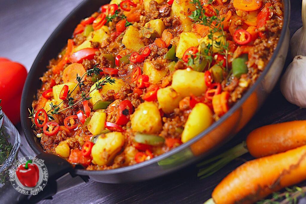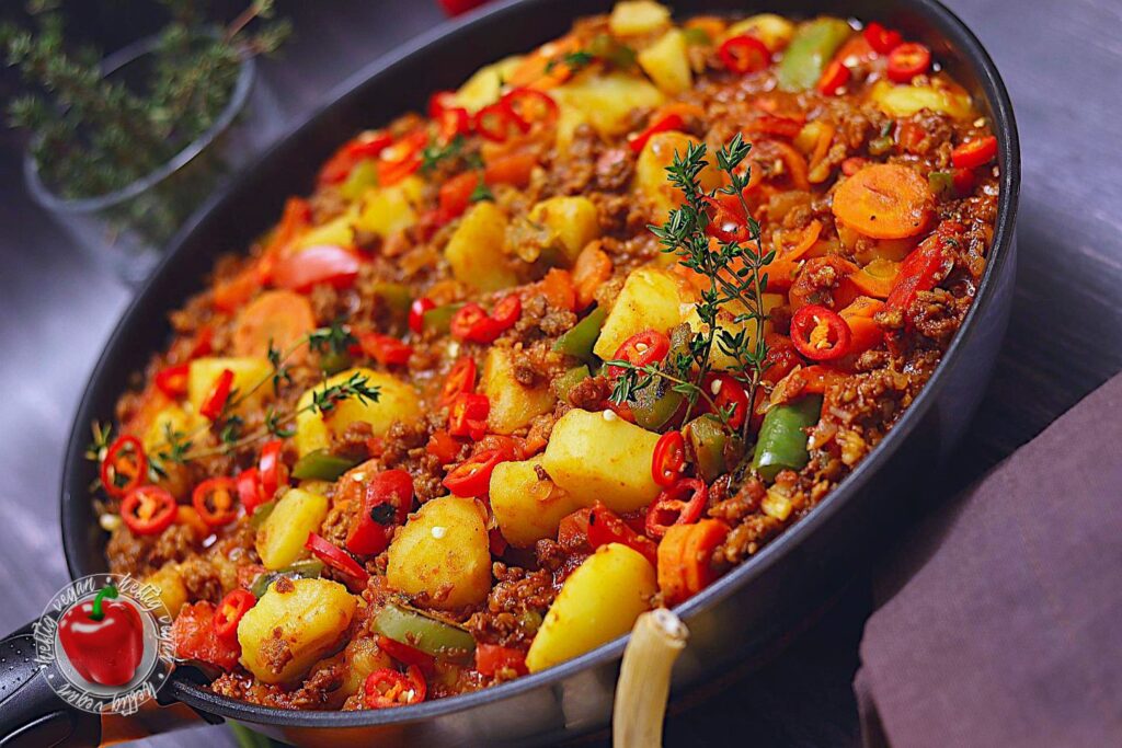 Seid ihr Freunde einer richtig deftigen Pfanne zum Mittag oder Abendessen? Ich freue mich sehr darüber, wenn es etwas zu Mampfen gibt, bei dem reichlich würzige Sauce vorhanden ist. Gepaart mit Paprika wird’s für mich dann noch mal interessanter. Und in diesem Fall ist es sogar ein Stücken nicht-vegane Vergangenheit, die ich mir zurückgeholt habe mit dem Bauerntopf mit Hack und Kartoffeln.
