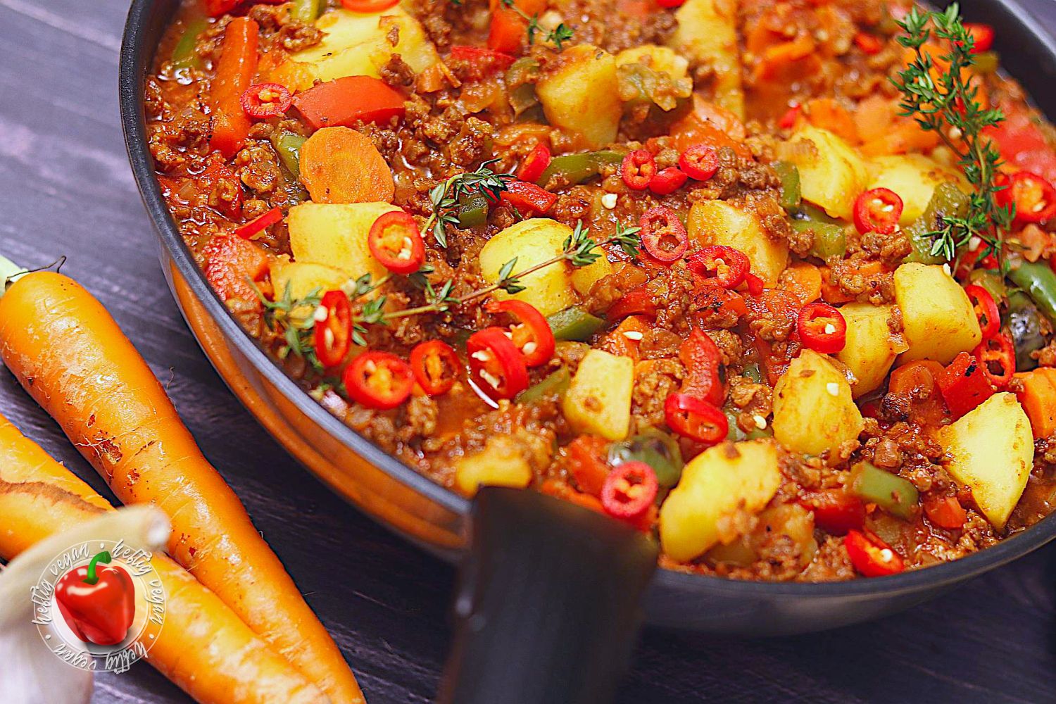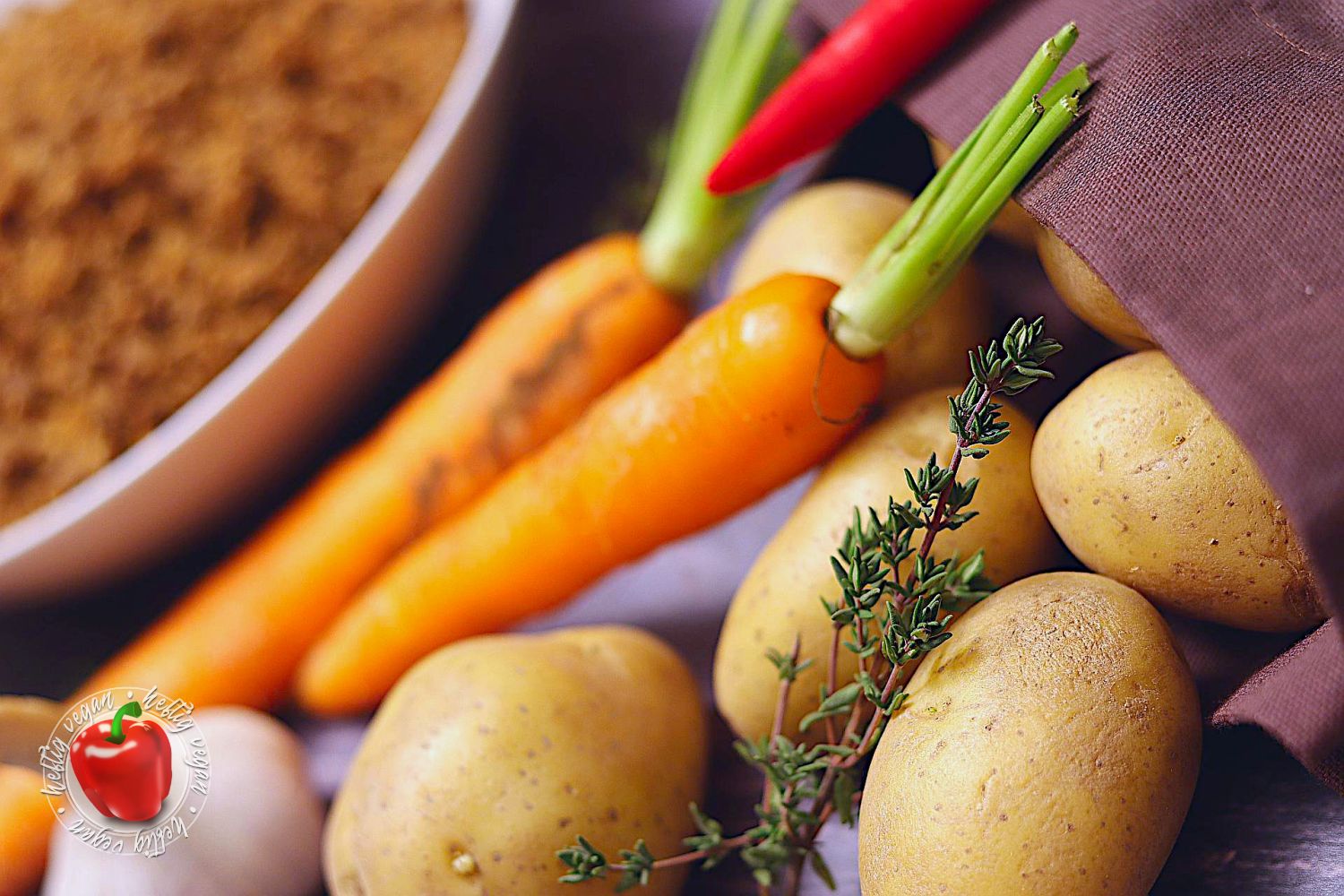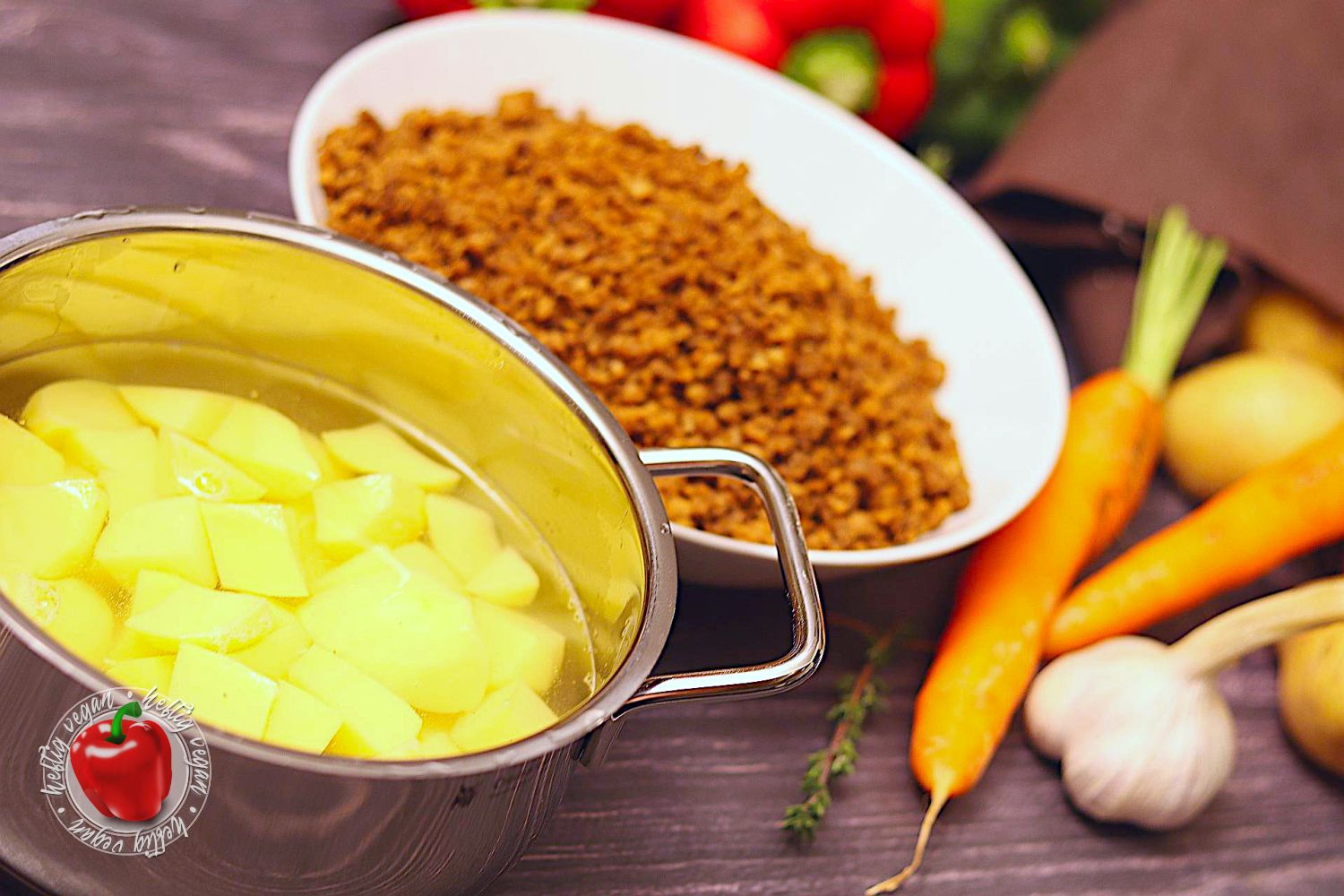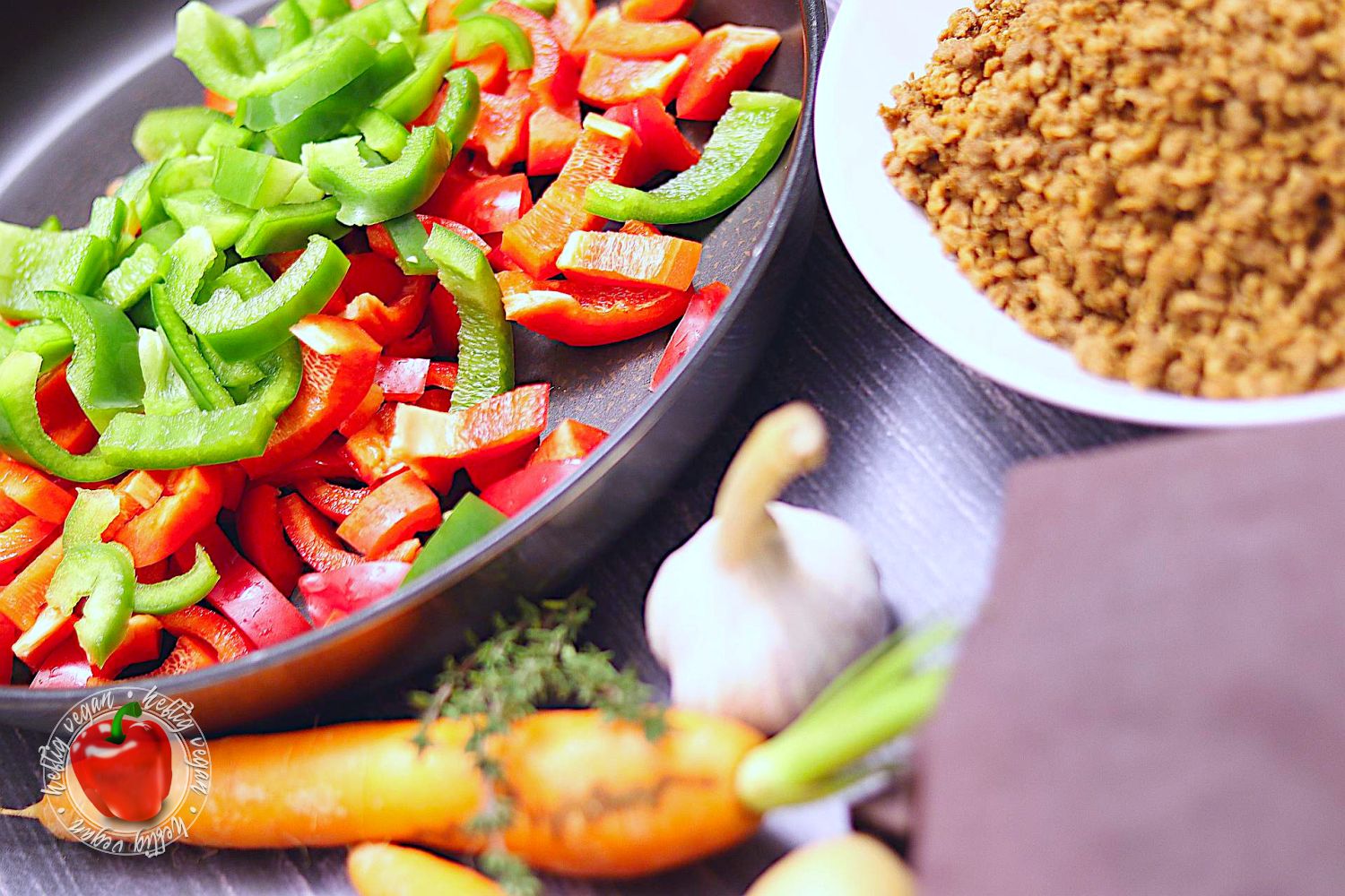 Ich bin mir tatsächlich nicht ganz sicher, ob das Gericht vor Maggi schon existent war oder durch die beliebten Fix-Päckchen erst richtig bekannt geworden ist. Aber den Bauerntopf mit Hack kenne ich als Pfannengericht aus Hackfleisch, Kartoffeln und Paprika. Gegart in einer sämigen, würzigen Tomatensauce. Die Sauce ähnelt durch das verwendete Hackfleisch ein wenig einer Bolognese-Sauce, doch der Tenor ändert sich noch einmal etwas durch die gebratene Paprika darin. Und genau so, möchte ich es wieder genießen. Nur eben rein pflanzlich. Darum greife ich wieder ein wenig in die Trickkiste, hole Kartoffeln, Möhren, Zwiebeln, Paprika und Tomaten hervor und los geht’s.