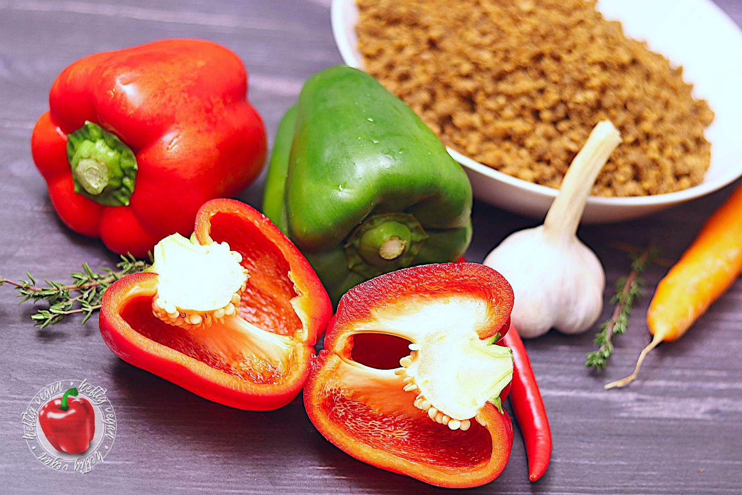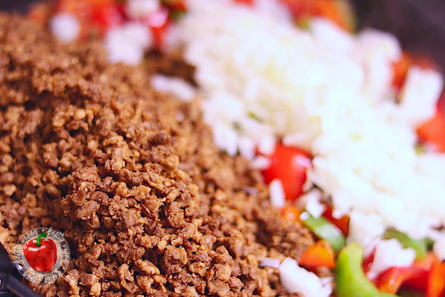 - 1 Stück Zwiebel, groß2 EL Fleisch- oder Gyroswürzmischung¹400 g Sojagranulat¹ oder Veggie Hack¹, küchenfertigDie Zwiebel zwischenzeitig schälen, fein hacken und mit dem Hack zusammen zur Paprika geben. Die Temperatur drosseln und alles dünsten. Mit einer Gyros- oder Fleischwürzmischung nach Wahl kräftig würzen – der Geschmack variiert je nach Würzmischung.