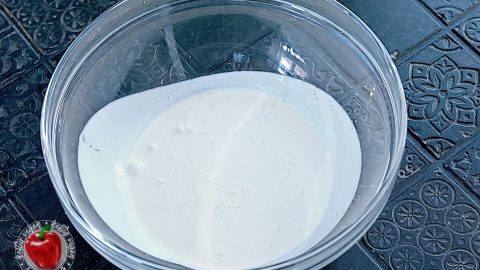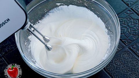 - 200 g Schlagcreme¹ (z. B. Rama oder Schlagfix)Den Kuchen aus dem Ofen nehmen und auf einem Gitter auskühlen lassen. Anschließend Schlagcreme in eine Rührschüssel geben.