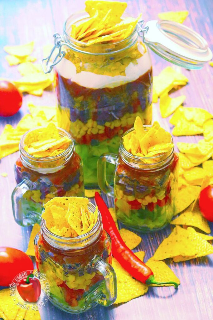 Eigentlich eine Party-Idee die es bei mir auf einer kleinen Feier vor Jahren schon mal gab. Erst kürzlich wurde ich an dieses tolle Rezept erinnert und dachte mir: Hey, gar nicht so schwer dieses Salatrezept auch vegan zu genießen. Immerhin gibt es viele Möglichkeiten die Schichten Gemüse zu variieren und an verschiedene Wünsche oder Bedürfnisse anzupassen. Daher sollte er auch bei dir Anklang finden. Hoffe ich zumindest. Heute also: Veganer Nacho-Salat. Ein Tex-Mex-Schichtsalat zum Knuspern.