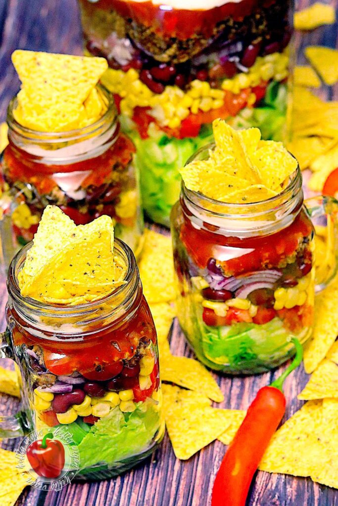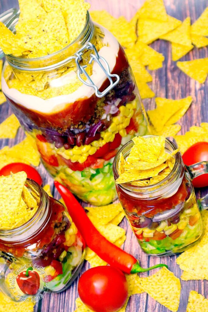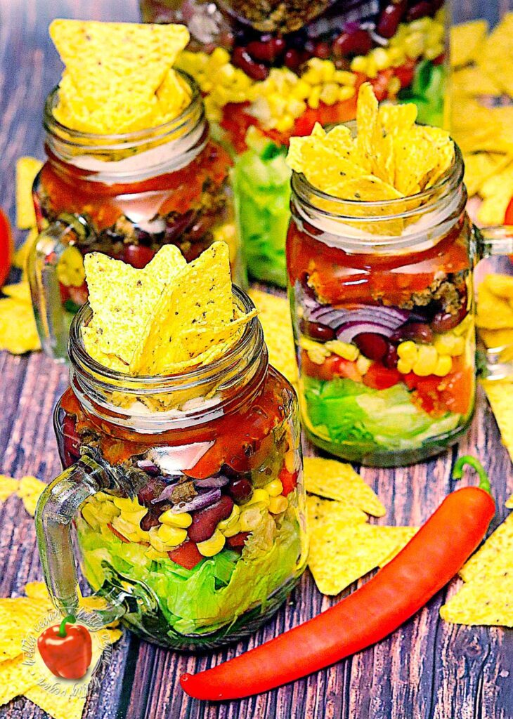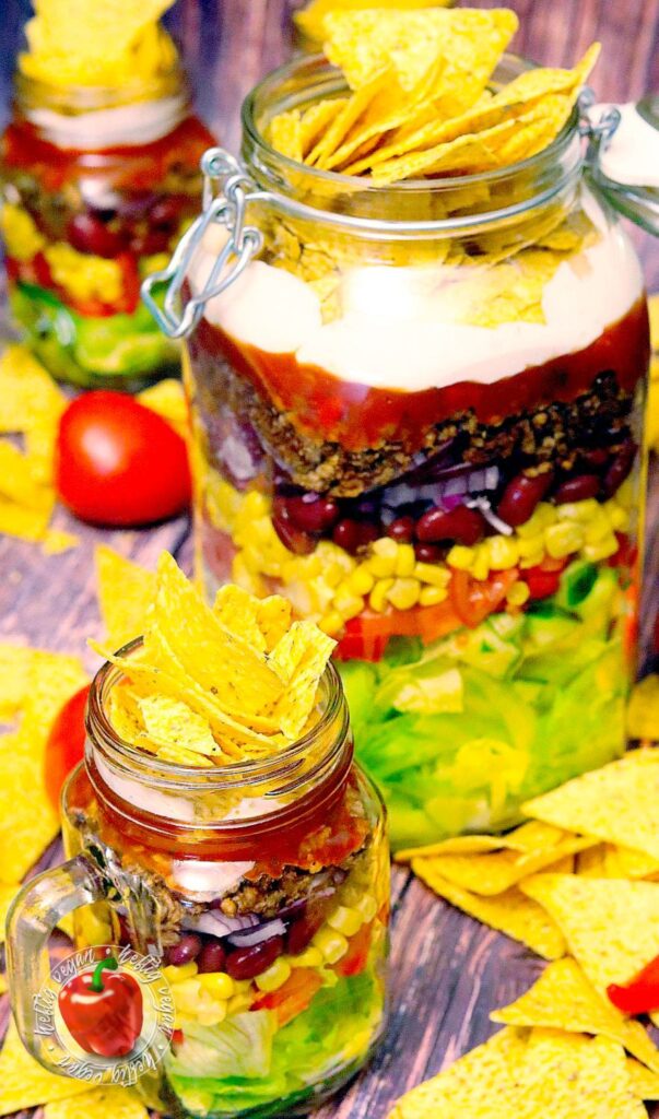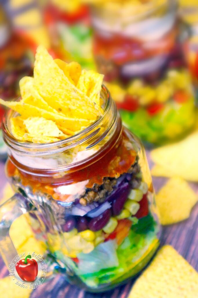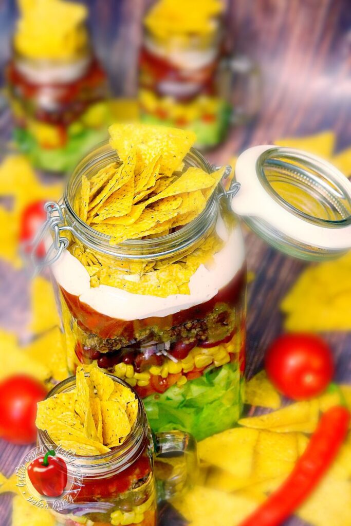 Ich finde bei diesem Rezept die Wahl des Dressings besonders gelungen. Die Kombination von Salsa und Creme Fraiche ergeben ein cremig-fruchtiges Dressing, dass den Salat angemessen würzt. Auch wenn diese als verschiedene Schichten aufgetragen werden, so wirst du beim Genießen feststellen, dass sich beide zu einer gemeinsamen, cremigen Sauce vereinen die entfernt ein wenig an ein Thousand-Island-Dressing erinnert.