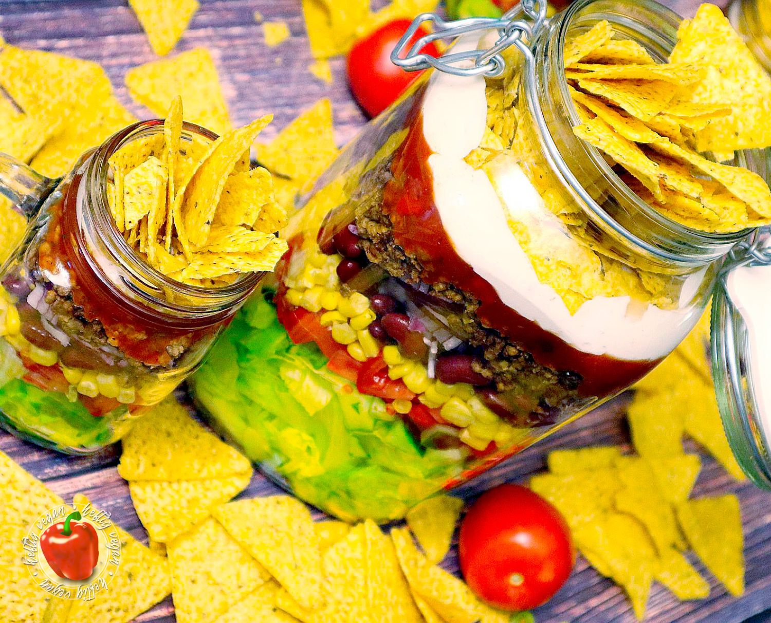 Neben einigen Tex-Mex-Gerichten wie dem 5-Minuten-Chili sin Carne, dem Lowfat Chili-Cheese-Burger oder Chimichanga habe ich viele weitere leckere amerikanisch-mexikanisch angehauchte Rezepte versprochen. Der Nacho-Salat ist nun infolge dessen eines dieser Rezepte, dass ich euch heute bieten möchte. Es handelt sich bei einem Nacho-Salat um einen mexikanischen Schichtsalat, bestehend aus Eisbergsalat, Tomaten, Gurken, Mais, Bohnen und Zwiebeln. Darüber hinaus kommen optional Hackfleisch-Alternativen, veganer Käse, Avocado und natürlich die namensgebenden Nachos zum Einsatz. Das Dressing besteht aus einer Tomatensalsa und veganer Creme Fraiche. Natürlich hast du hier diverse Optionen zum abwandeln und anpassen.