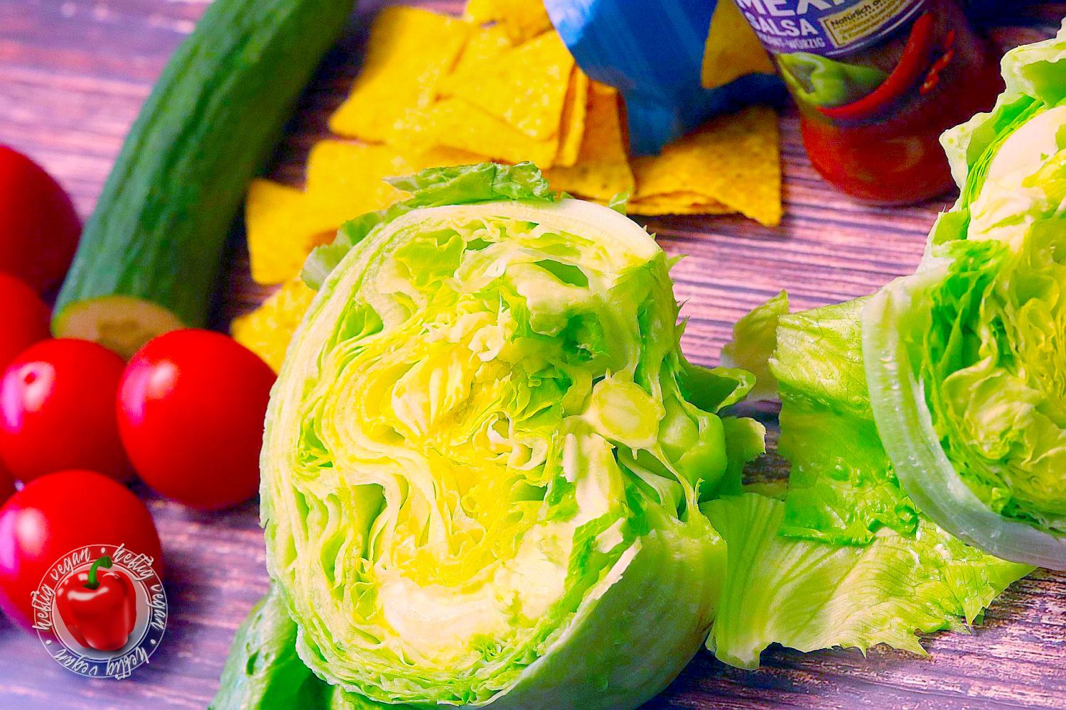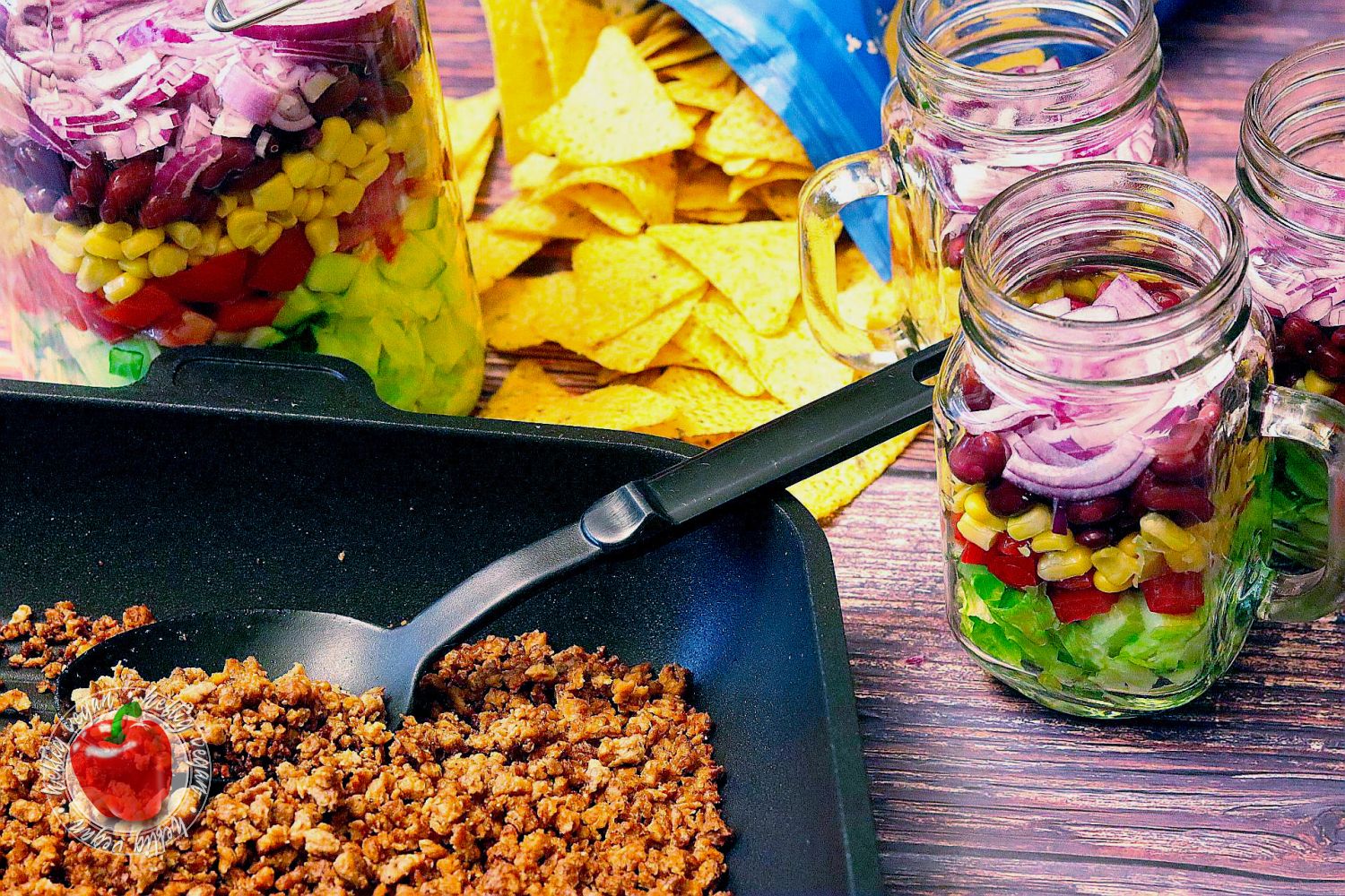 Neben einigen Tex-Mex-Gerichten wie dem 5-Minuten-Chili sin Carne, dem Lowfat Chili-Cheese-Burger oder Chimichanga habe ich viele weitere leckere amerikanisch-mexikanisch angehauchte Rezepte versprochen. Der Nacho-Salat ist nun infolge dessen eines dieser Rezepte, dass ich euch heute bieten möchte. Es handelt sich bei einem Nacho-Salat um einen mexikanischen Schichtsalat, bestehend aus Eisbergsalat, Tomaten, Gurken, Mais, Bohnen und Zwiebeln. Darüber hinaus kommen optional Hackfleisch-Alternativen, veganer Käse, Avocado und natürlich die namensgebenden Nachos zum Einsatz. Das Dressing besteht aus einer Tomatensalsa und veganer Creme Fraiche. Natürlich hast du hier diverse Optionen zum abwandeln und anpassen.