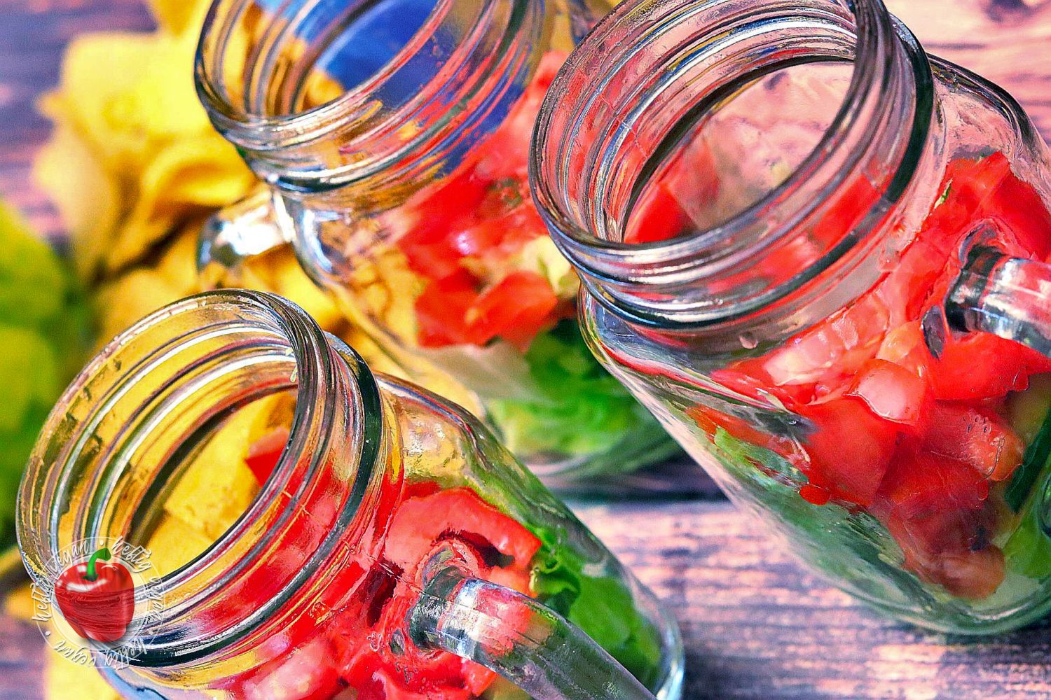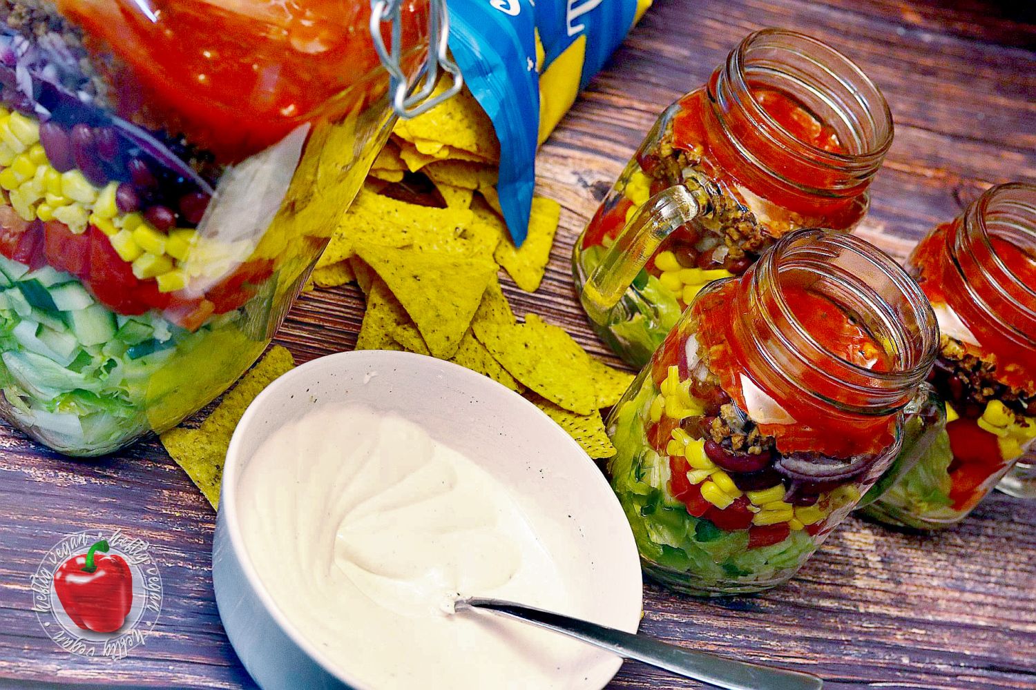 Ich finde bei diesem Rezept die Wahl des Dressings besonders gelungen. Die Kombination von Salsa und Creme Fraiche ergeben ein cremig-fruchtiges Dressing, dass den Salat angemessen würzt. Auch wenn diese als verschiedene Schichten aufgetragen werden, so wirst du beim Genießen feststellen, dass sich beide zu einer gemeinsamen, cremigen Sauce vereinen die entfernt ein wenig an ein Thousand-Island-Dressing erinnert.