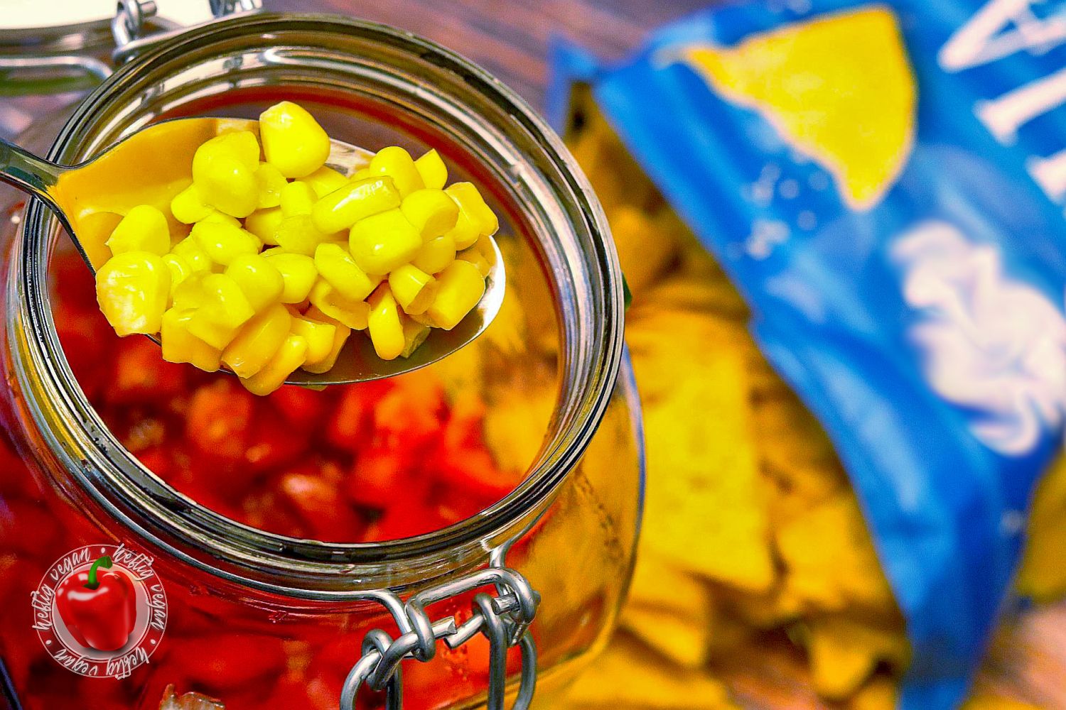 Nutze für die Salsa nach Möglichkeit eine wenig süße Rezeptur. Wenn du damit wenig anfangen kannst, könntest du dich beispielsweise an meiner frischen Tomatensalsa orientieren. Alternativ gibt es viele Saucen auf dem Markt deren Inhaltsstoffe lt. Etikett pflanzlicher Natur sind. Darunter Knorr, Kühne, Maggi oder der mexikanische „Snacksperte“ Fuego.