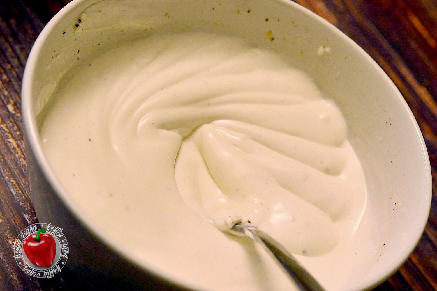 - Die Creme Fraiche in einer kleinen Schale mit der Pflanzenmilch glattrühren. Anschließend mit Salz und Pfeffer würzen und ebenfalls über den Salat geben.