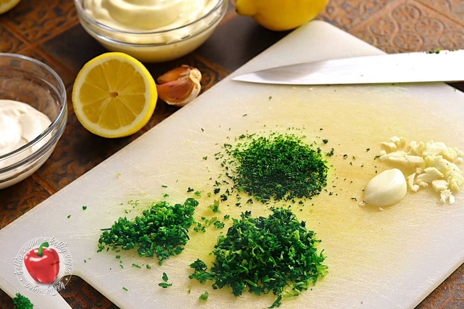 - 1 Zehe Knoblauch, frisch1 TL Schnittlauch, frisch oder TK1 TL Petersilie, frisch oder TK1 TL Dill, frisch oder TKDie frischen Kräuter waschen, trocken tupfen und fein hacken. Knoblauch schälen und ebenfalls fein hacken.