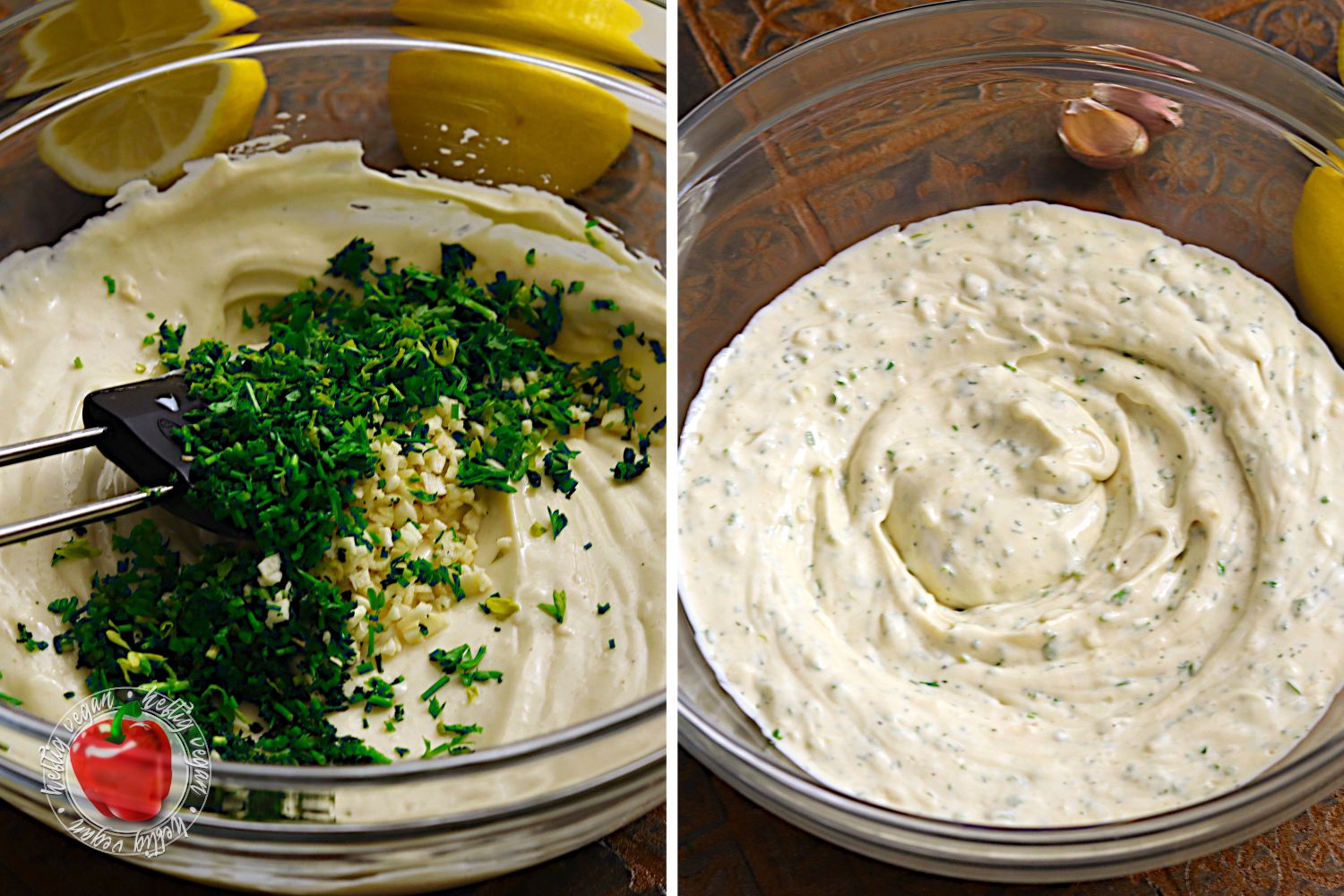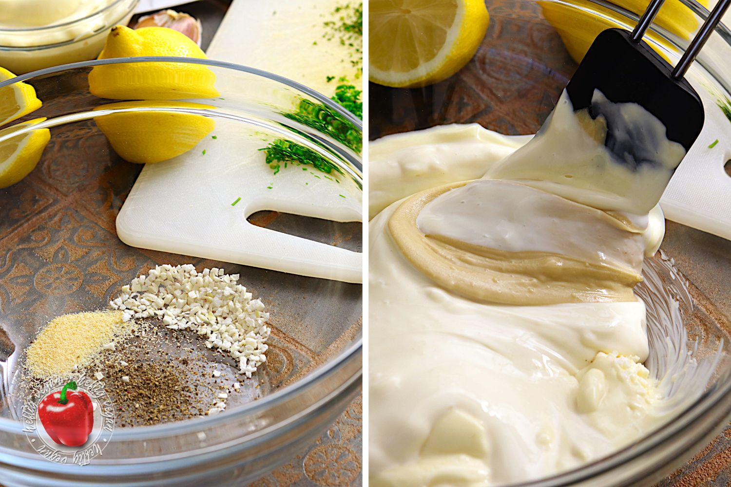 - ½ TL Knoblauch¹, granuliert½ TL Salzn. B. Schwarzer Pfeffer¹½ TL Zwiebeln¹, getrocknet & fein gehacktIn einer großen Schüssel Knoblauch und Zwiebeln geben. Salz hinzufügen. Nun Mayonnaise, Joghurt und Cashewmus hinzugeben und solange miteinander verrühren, bis die Mischung glatt ist.