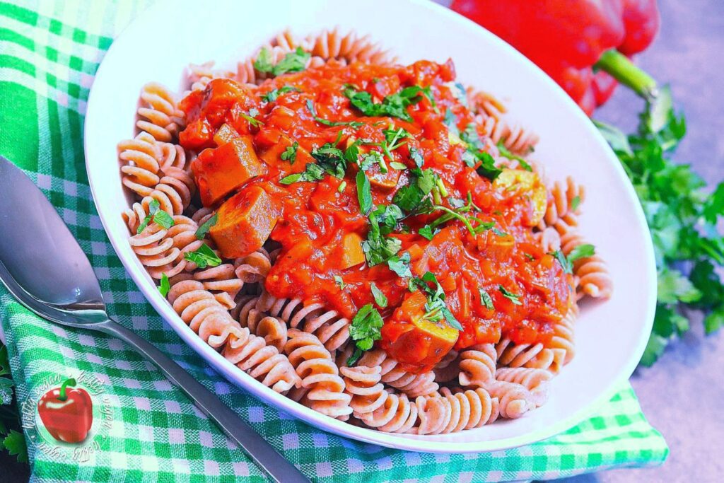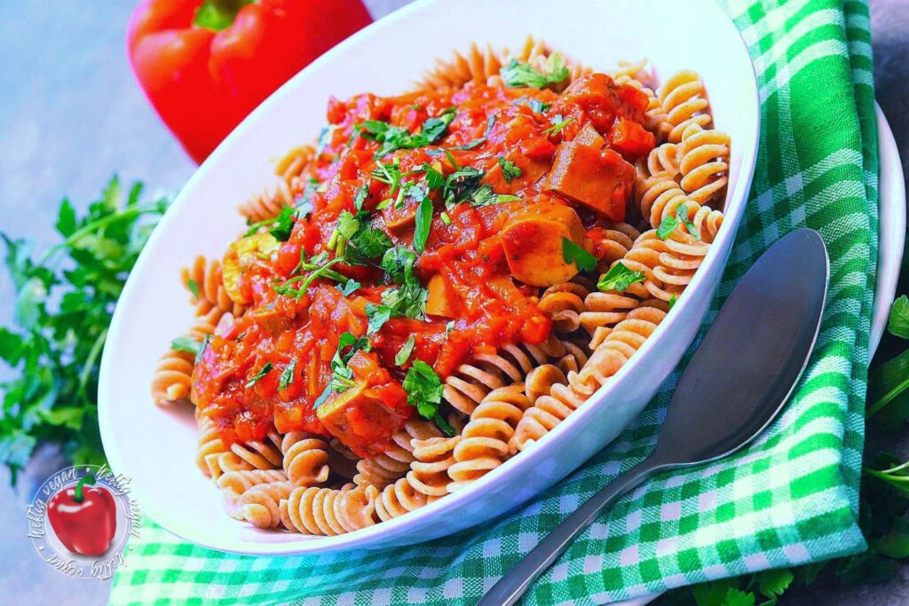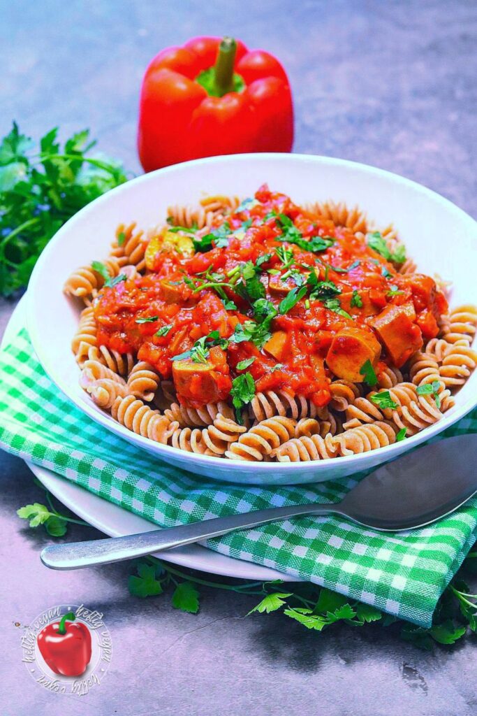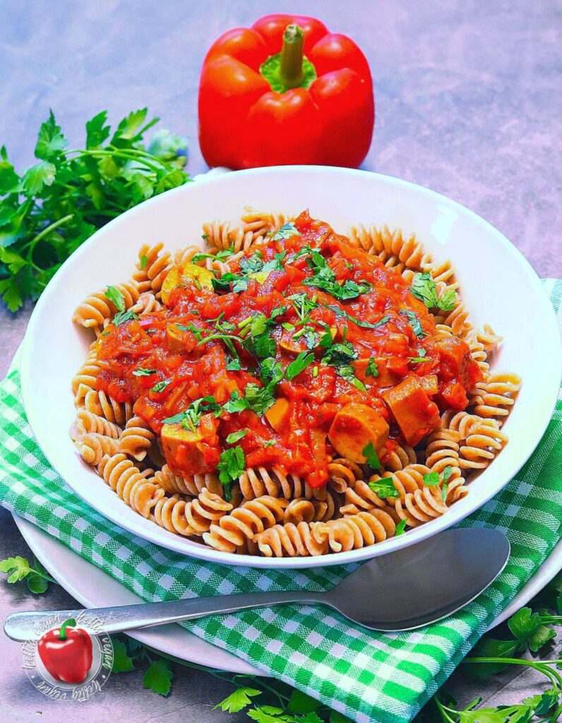 Ich möchte mich ja nicht in die Nesseln setzen, aber ähnlich wie Soljanka, meine ich mich zu Erinnern das Würstchengulasch auch ein aus dem Osten verbreitetes Gericht ist, das in der ehemaligen DDR sehr verbreitet war. Ob das nun genau so zubereitet wurde wie ich es heute koche, selbst wen man den Faktor vegan mal beiseite ließe, wage ich zu bezweifeln. Aber mir gefällt meine Rezeptur sehr. Und ich hoffe, auch dich damit zu begeistern. Es ist eine paprikalastige Tomatensauce auf Basis von passierten Tomaten, gewürzt mit Paprika, Paprika und… du ahnst es? Noch mehr Paprika mit einer leicht rauchigen Note. Und da mir das nicht genügt enthält sie Unmengen frische Paprika. Darüber hinaus außerdem Zwiebeln und ein Hauch getrocknete, italienische Kräuter. Als Basis wird zu diesem Gericht Pasta gereicht.