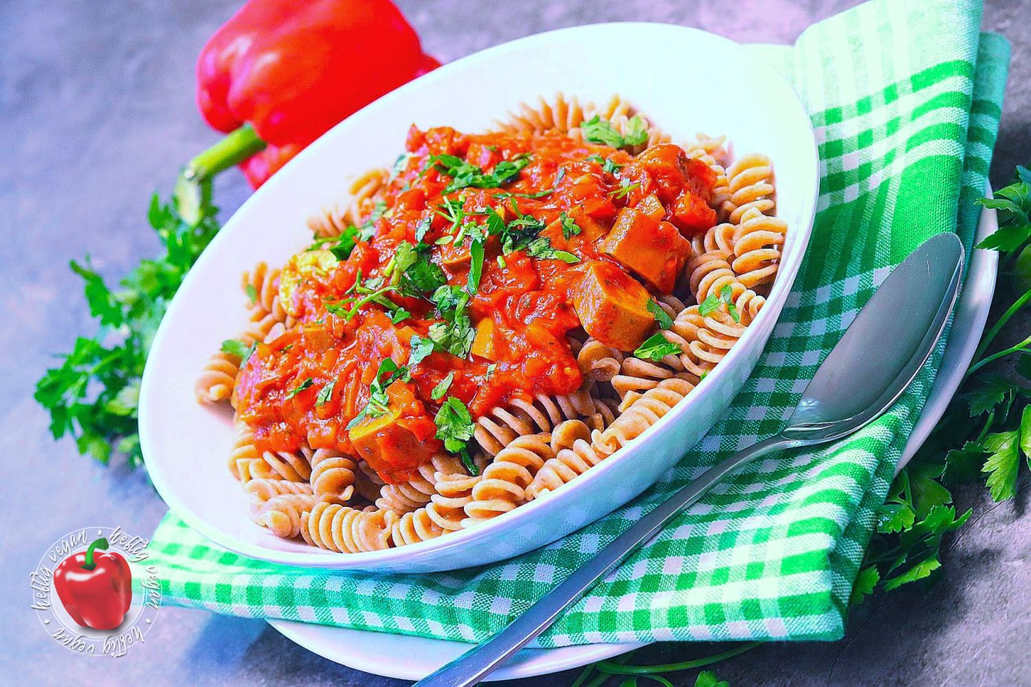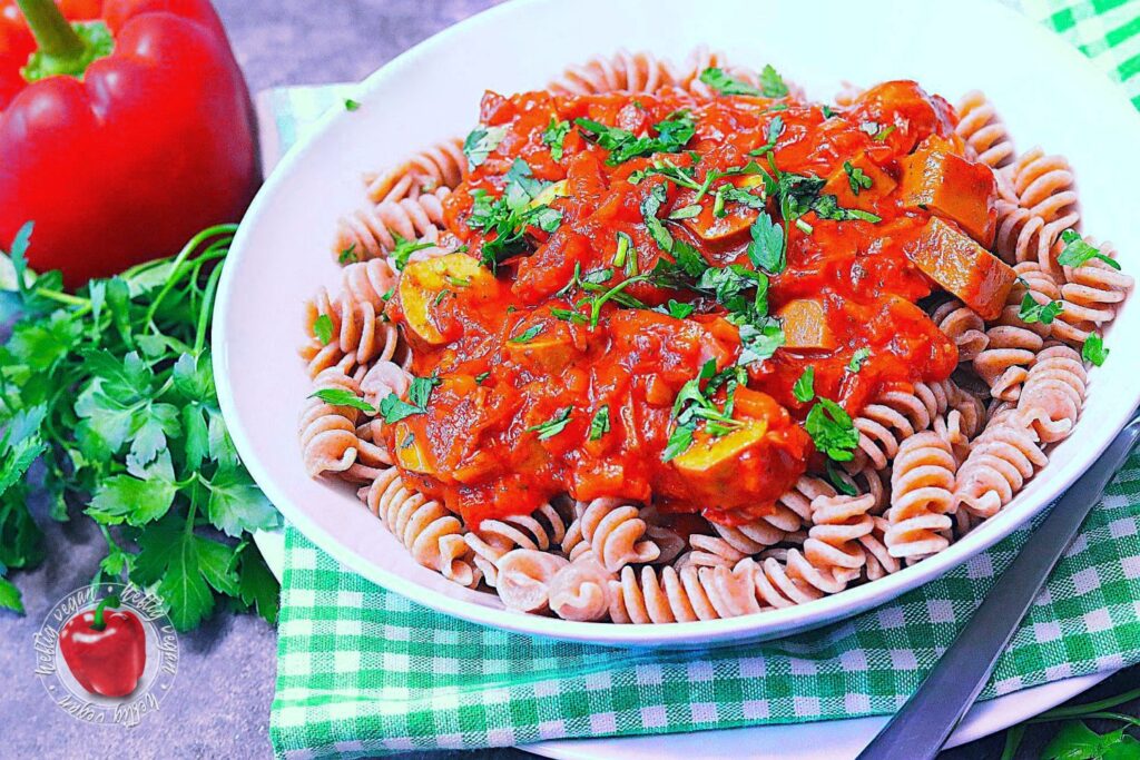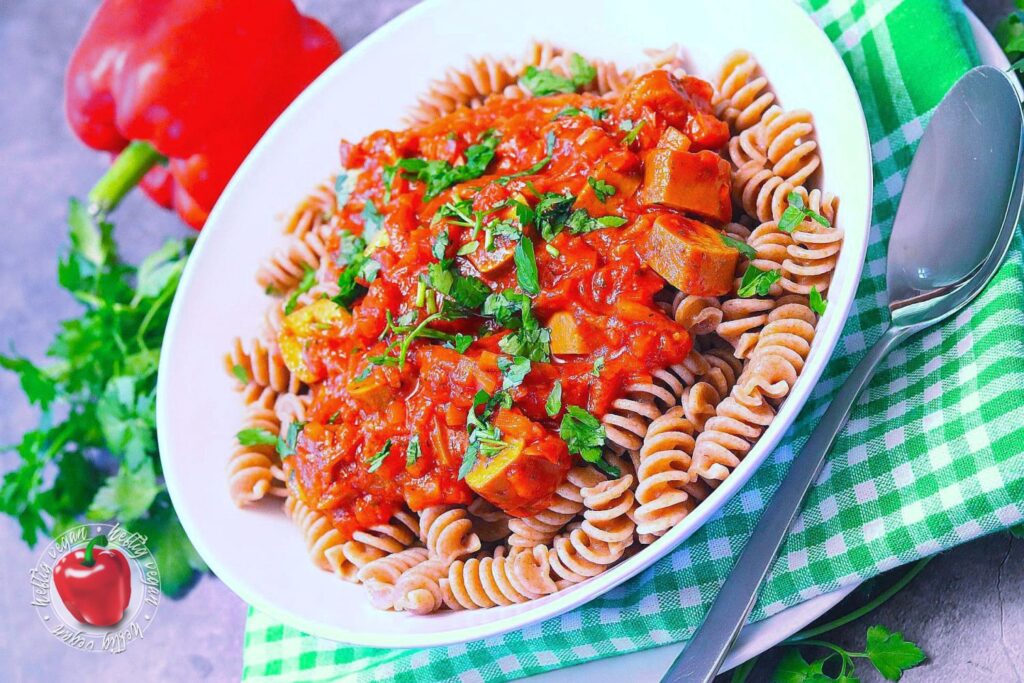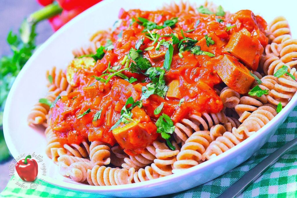 Ich möchte mich ja nicht in die Nesseln setzen, aber ähnlich wie Soljanka, meine ich mich zu Erinnern das Würstchengulasch auch ein aus dem Osten verbreitetes Gericht ist, das in der ehemaligen DDR sehr verbreitet war. Ob das nun genau so zubereitet wurde wie ich es heute koche, selbst wen man den Faktor vegan mal beiseite ließe, wage ich zu bezweifeln. Aber mir gefällt meine Rezeptur sehr. Und ich hoffe, auch dich damit zu begeistern. Es ist eine paprikalastige Tomatensauce auf Basis von passierten Tomaten, gewürzt mit Paprika, Paprika und… du ahnst es? Noch mehr Paprika mit einer leicht rauchigen Note. Und da mir das nicht genügt enthält sie Unmengen frische Paprika. Darüber hinaus außerdem Zwiebeln und ein Hauch getrocknete, italienische Kräuter. Als Basis wird zu diesem Gericht Pasta gereicht.