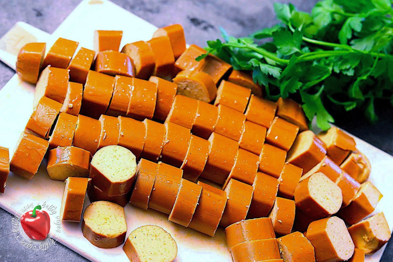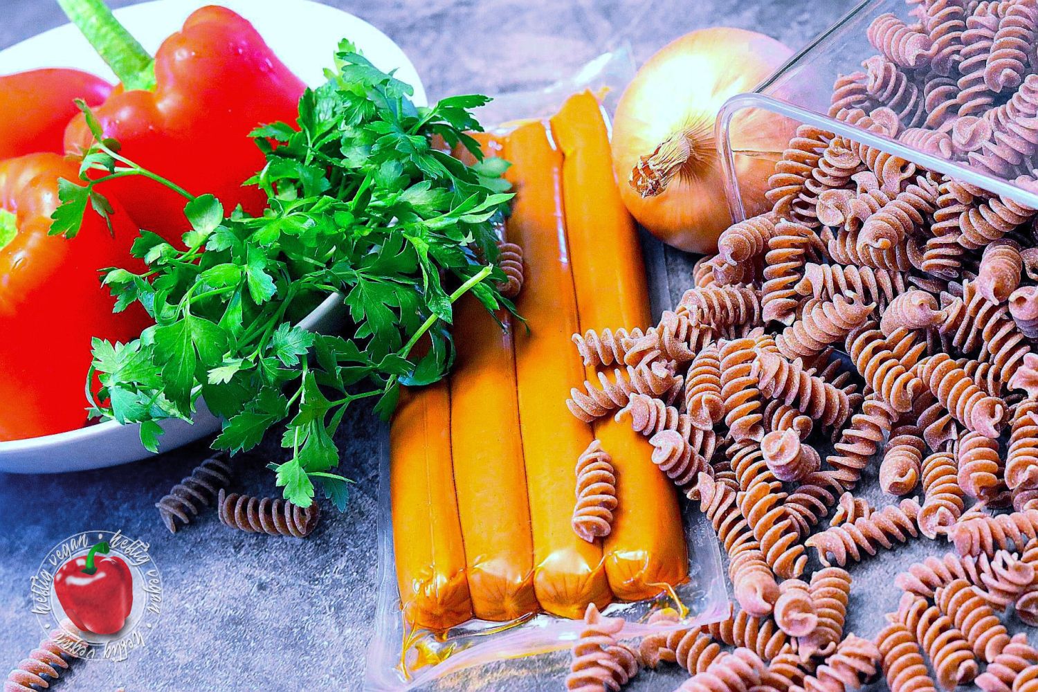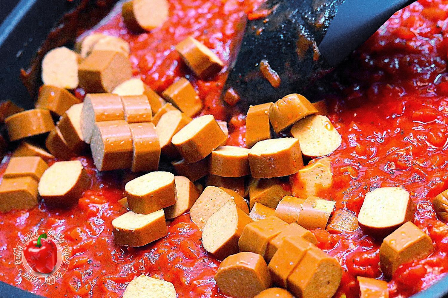Ich möchte mich ja nicht in die Nesseln setzen, aber ähnlich wie Soljanka, meine ich mich zu Erinnern das Würstchengulasch auch ein aus dem Osten verbreitetes Gericht ist, das in der ehemaligen DDR sehr verbreitet war. Ob das nun genau so zubereitet wurde wie ich es heute koche, selbst wen man den Faktor vegan mal beiseite ließe, wage ich zu bezweifeln. Aber mir gefällt meine Rezeptur sehr. Und ich hoffe, auch dich damit zu begeistern. Es ist eine paprikalastige Tomatensauce auf Basis von passierten Tomaten, gewürzt mit Paprika, Paprika und… du ahnst es? Noch mehr Paprika mit einer leicht rauchigen Note. Und da mir das nicht genügt enthält sie Unmengen frische Paprika. Darüber hinaus außerdem Zwiebeln und ein Hauch getrocknete, italienische Kräuter. Als Basis wird zu diesem Gericht Pasta gereicht.