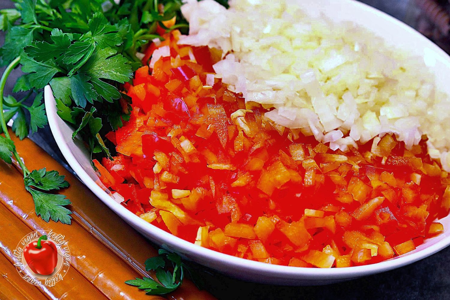 - Paprika halbieren, entkernen und den Strunk herausschneiden. Anschließend in Viertel zerteilen und sehr feine Würfel daraus schneiden. Zwiebel ebenfalls halbieren und zu sehr feinen Würfeln schneiden.