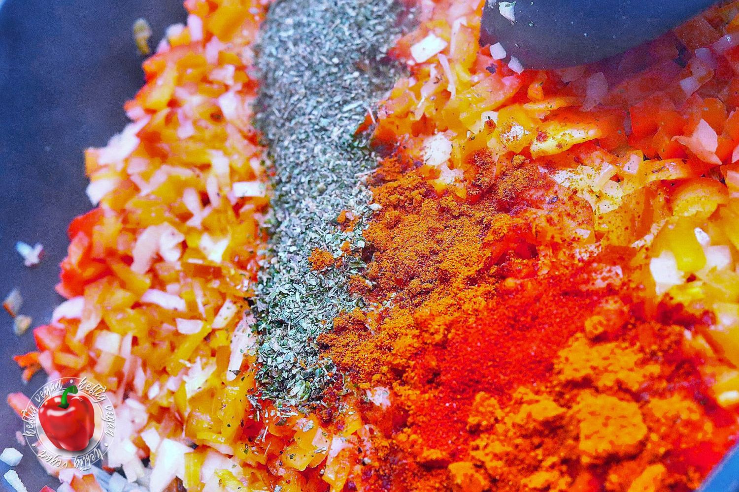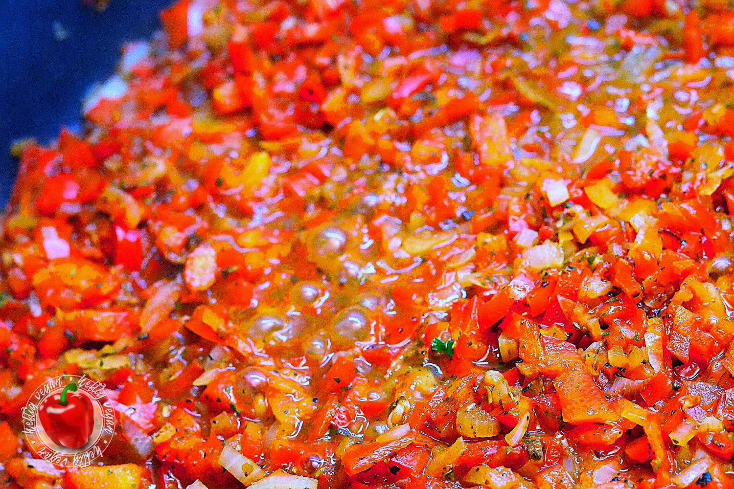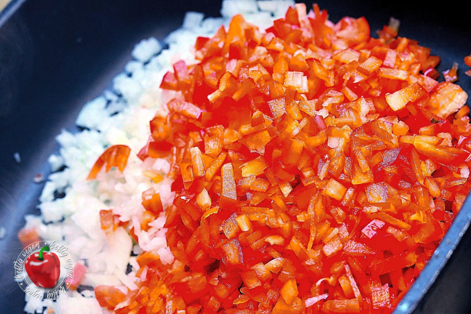 - In einer Pfanne etwas Öl erhitzen und die Zwiebeln darin anschwitzen. (Falls Möhren verwendet werden, diese ab sofort mitgaren. Tofu-Wiener kommen im Ggs. dazu erst zum Schluss hinein.) Paprikawürfel hinzugeben und für wenige Minuten mit braten.