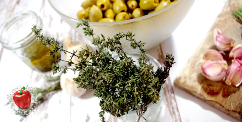 - Den Knoblauch schälen und fein hacken. (Hast du frische Kräuter da, solltest du sie vorher waschen. Falls sie schon getrocknet sind (in meinem Fall habe ich sie selbst getrocknet und vor Wochen schon gewaschen gehabt) kannst du diese direkt verwenden.) Die Blätter von den Kräuter-Stengeln zupfen und mit einem sehr scharfen Messer sehr fein herunter schneiden. Alles zu den Oliven geben.