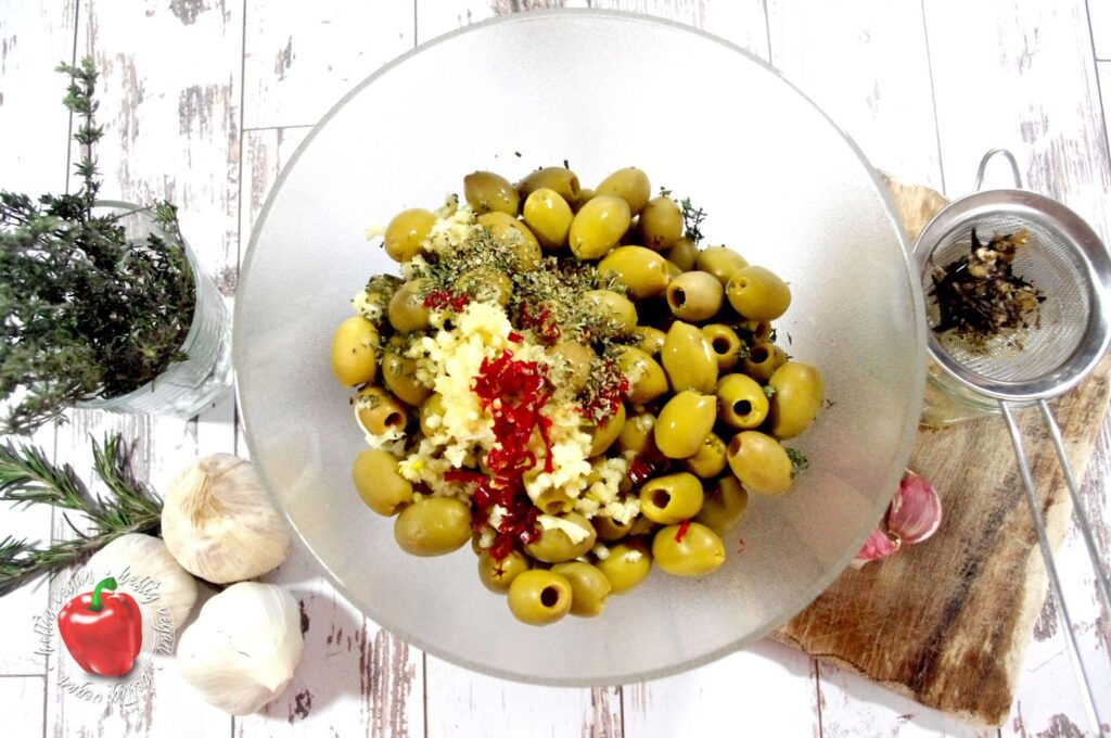 - Chili fein hacken und zusammen mit dem Trockengewürz ebenfalls zu den Oliven geben.