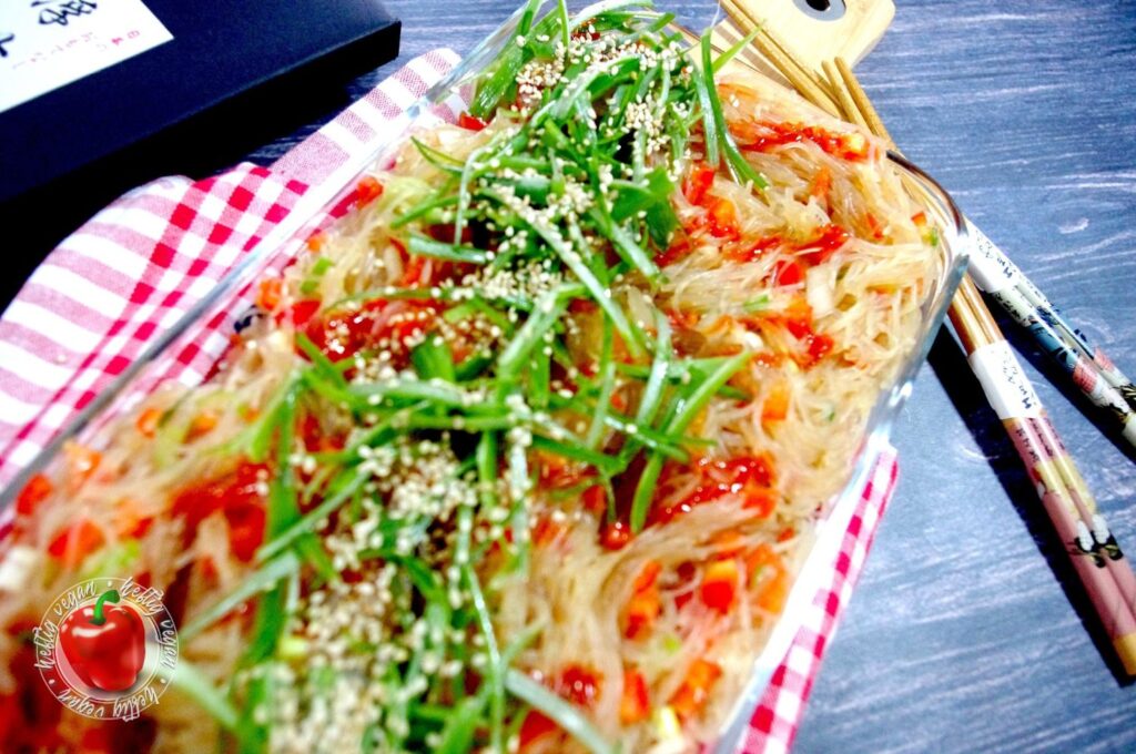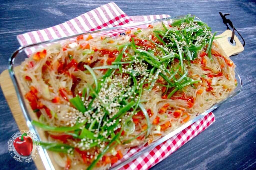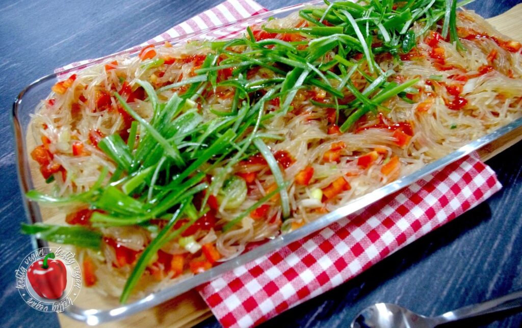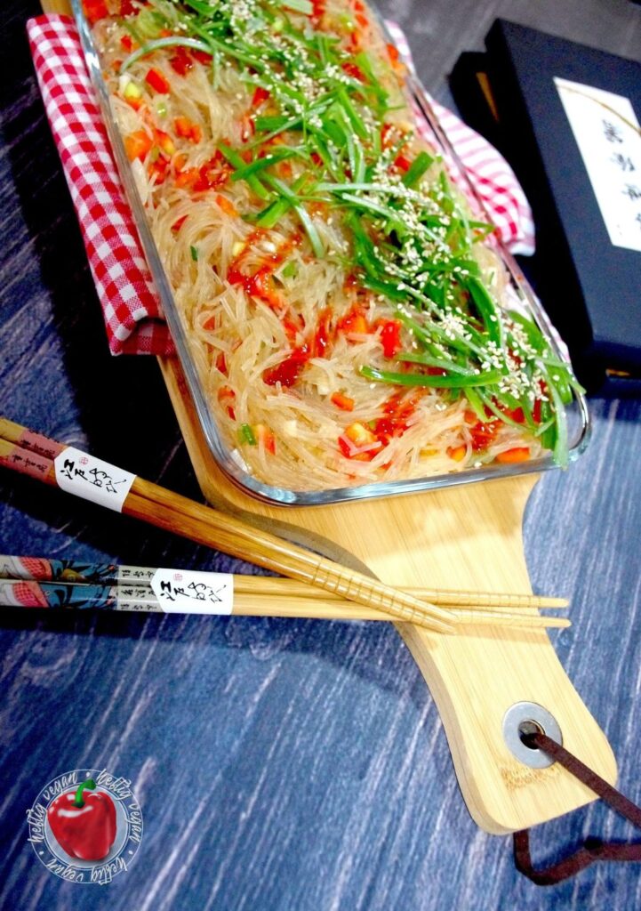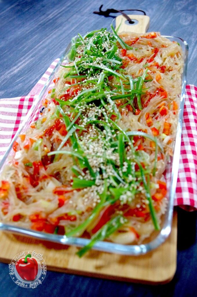 Heute habe ich mal wieder etwas total Köstliches für dich. Ein Rezept, dessen Inspiration schon ein paar Jahre zurück lag: Pikaner Glasnudelsalat. Vorbild ist ein „rauchiger“ Vorspeisensalat aus Glasnudeln den es damals beim asiatischen Mischbuffet meines Lieblingskoreaners in der Stadt gegeben hat. Ich habe mich angestrengt an das Gericht heranzureichen. Es ist mir – zumindest zum Großteil – gelungen.