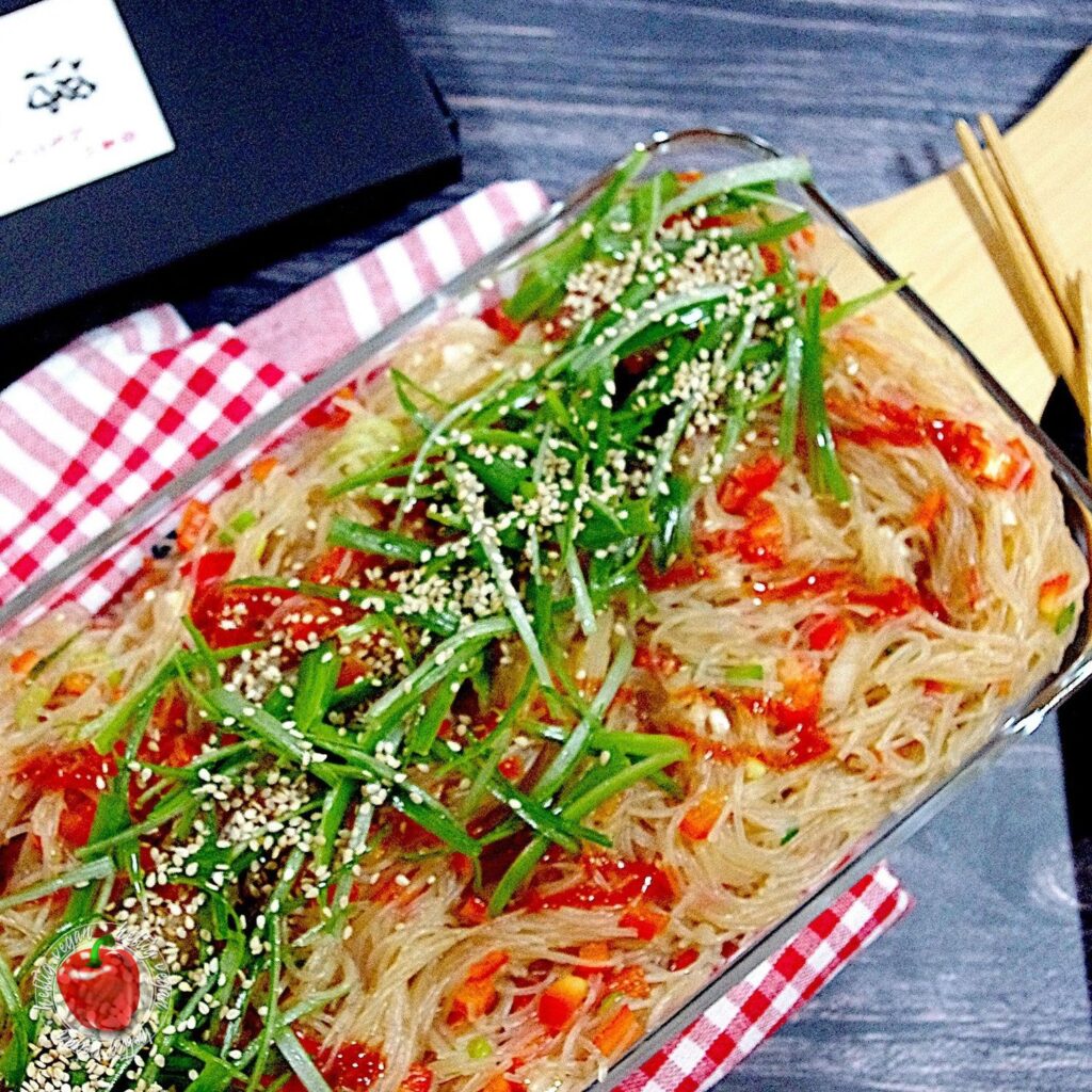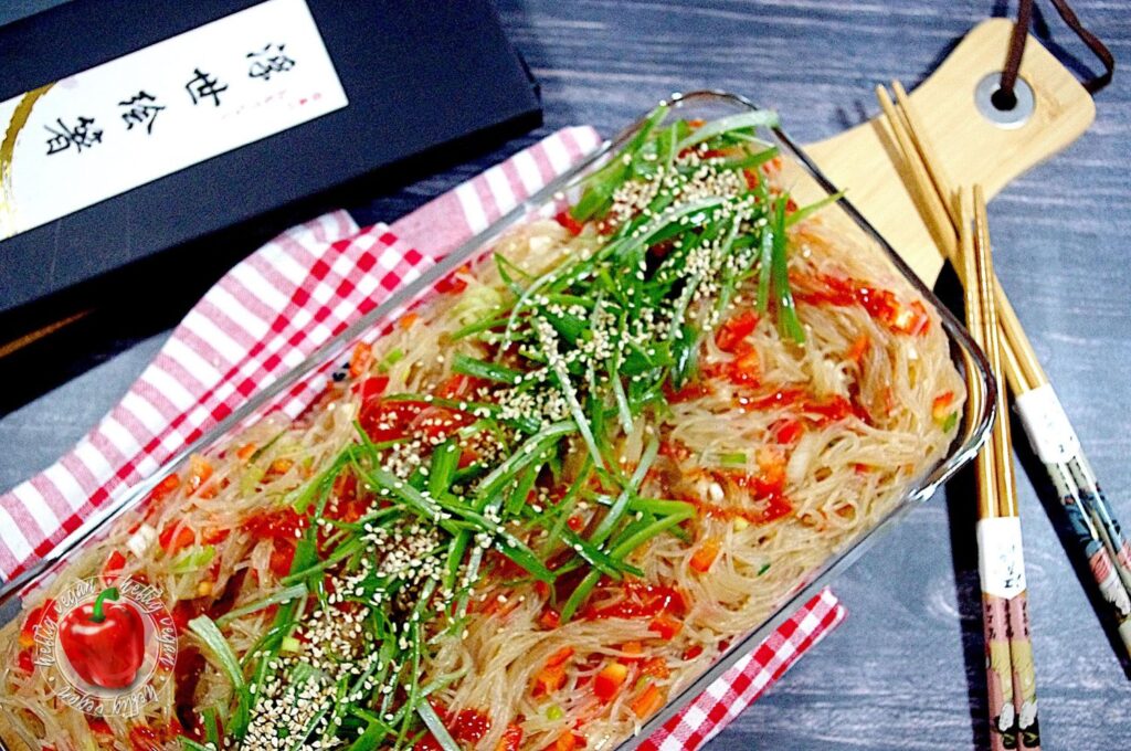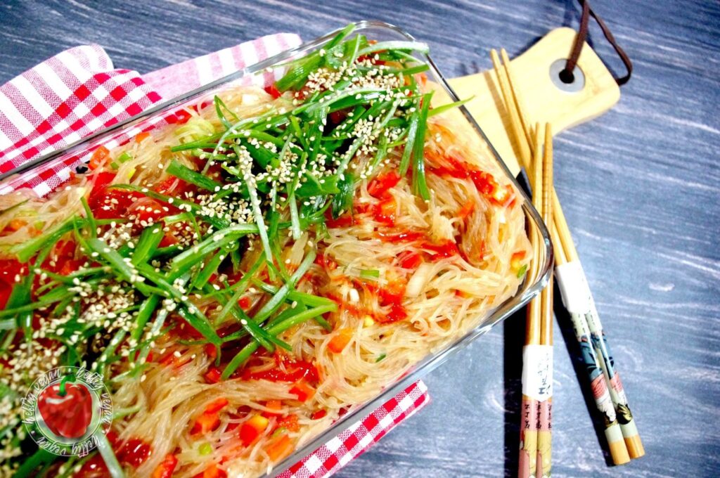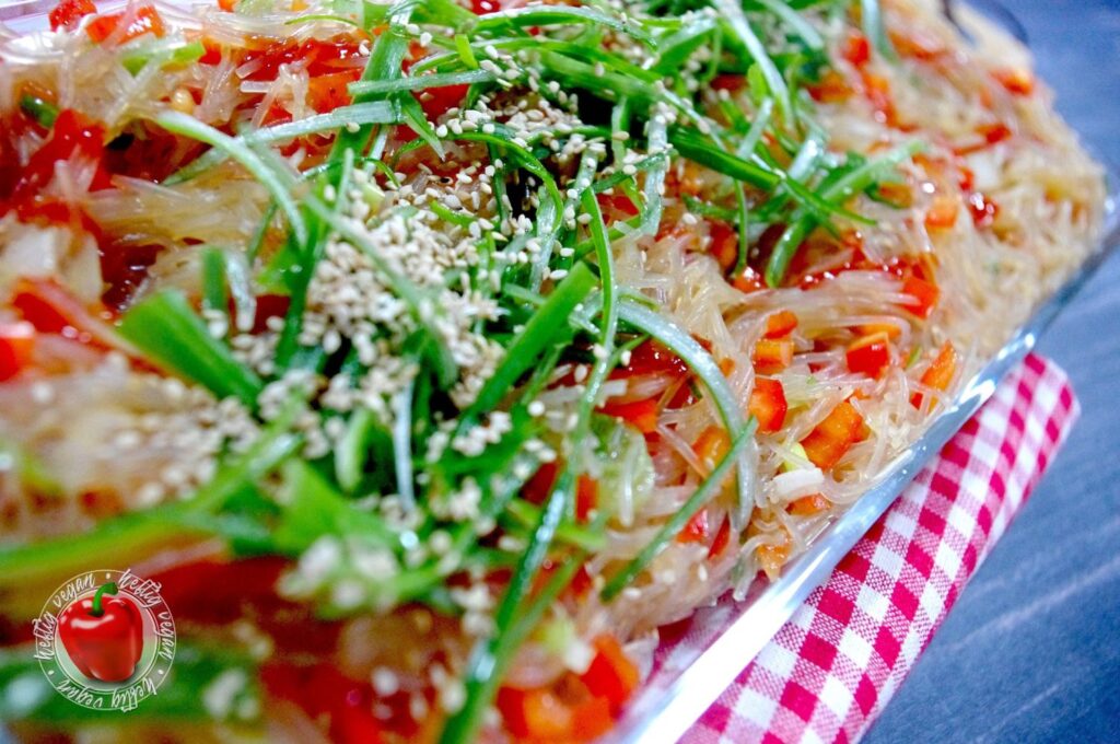 Heute habe ich mal wieder etwas total Köstliches für dich. Ein Rezept, dessen Inspiration schon ein paar Jahre zurück lag: Pikaner Glasnudelsalat. Vorbild ist ein „rauchiger“ Vorspeisensalat aus Glasnudeln den es damals beim asiatischen Mischbuffet meines Lieblingskoreaners in der Stadt gegeben hat. Ich habe mich angestrengt an das Gericht heranzureichen. Es ist mir – zumindest zum Großteil – gelungen.